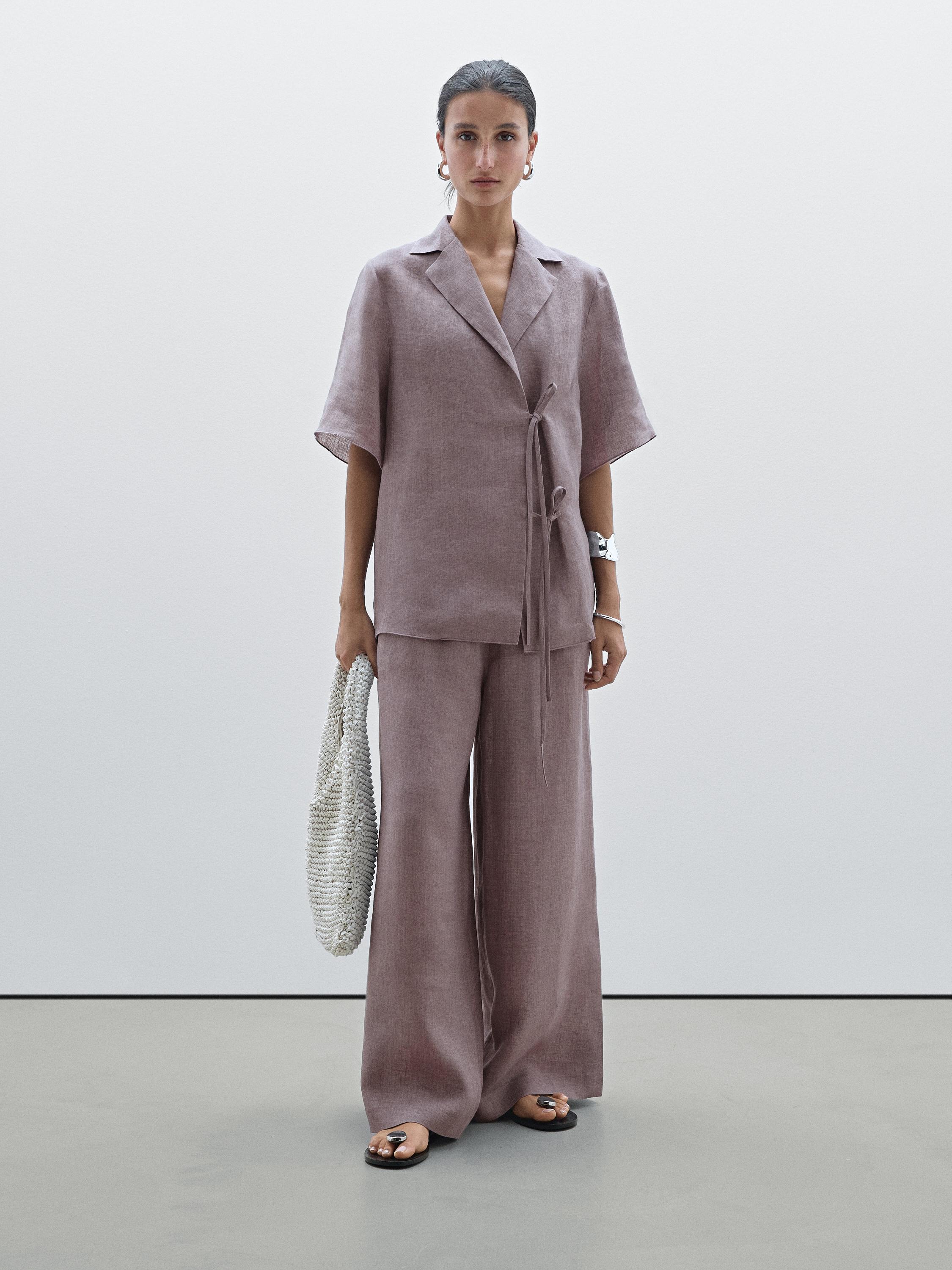Straight fit trousers. Made from linen. Elasticated waistband detail. Two side pockets. Side vents at the hem. Flowing fabric. Matching garment available.