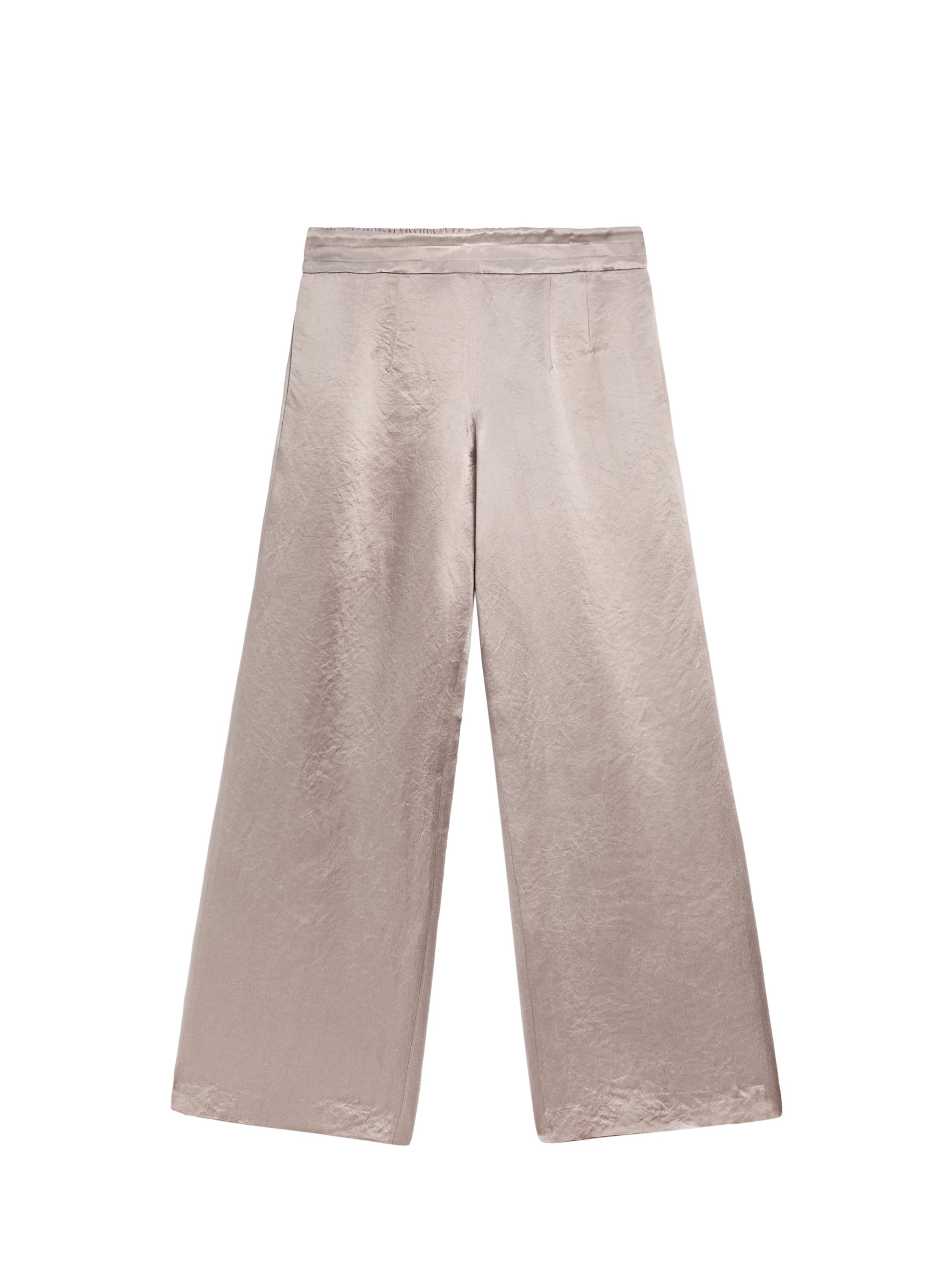 بنطلون بساق عريضة من قماش فضفاض. ملمس ساتاني. تفاصيل حزام مشد محبوك عند الخصر. خصر مرن من الخلف. جيوب على الجانبين. متاح قطعة بلون مماثل.