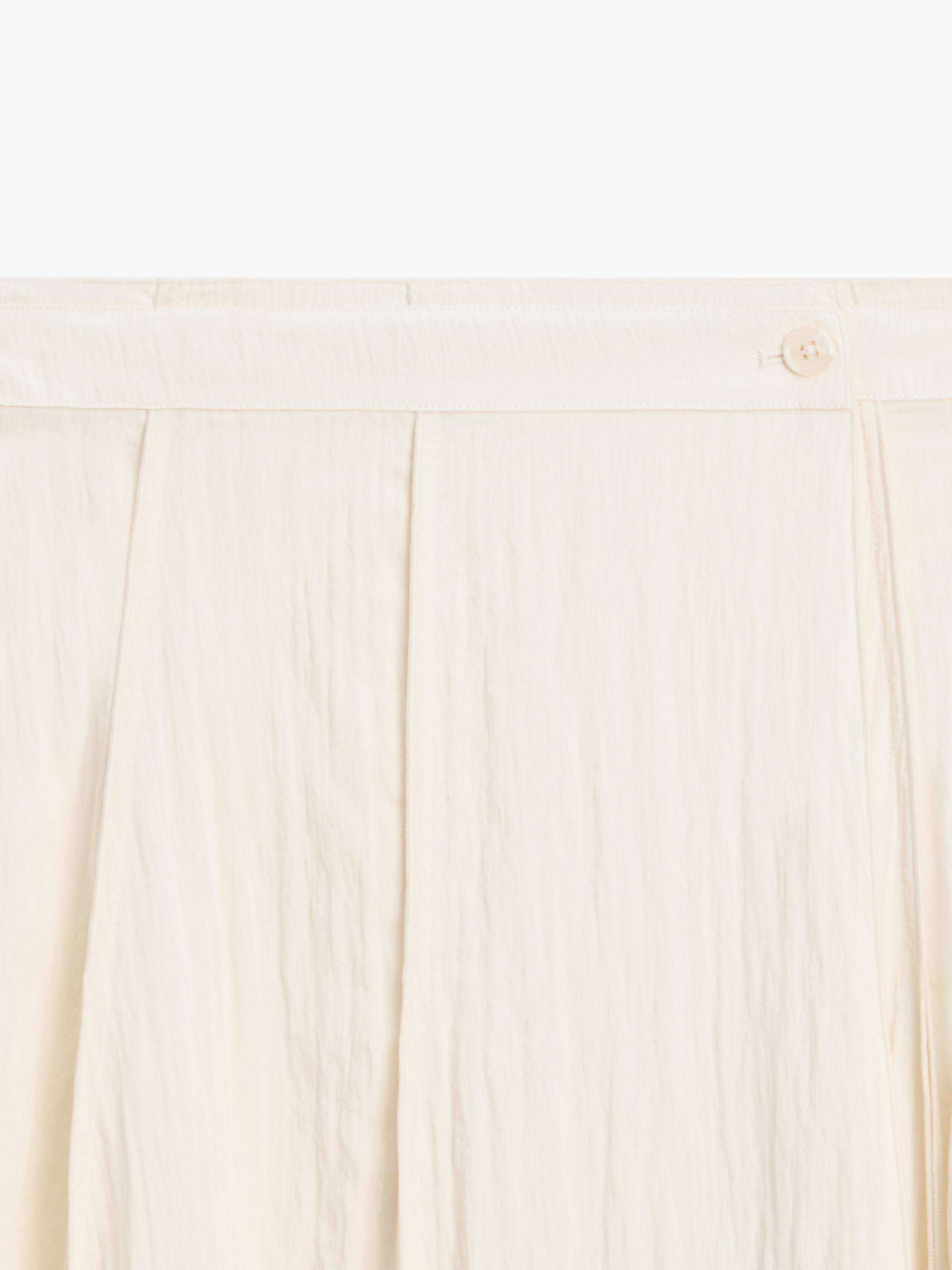 Midi skirt made of viscose blend fabric. Lightweight technical fabric. Sash detail at the waist. Wrap fastening with side button. Ruffled detail.