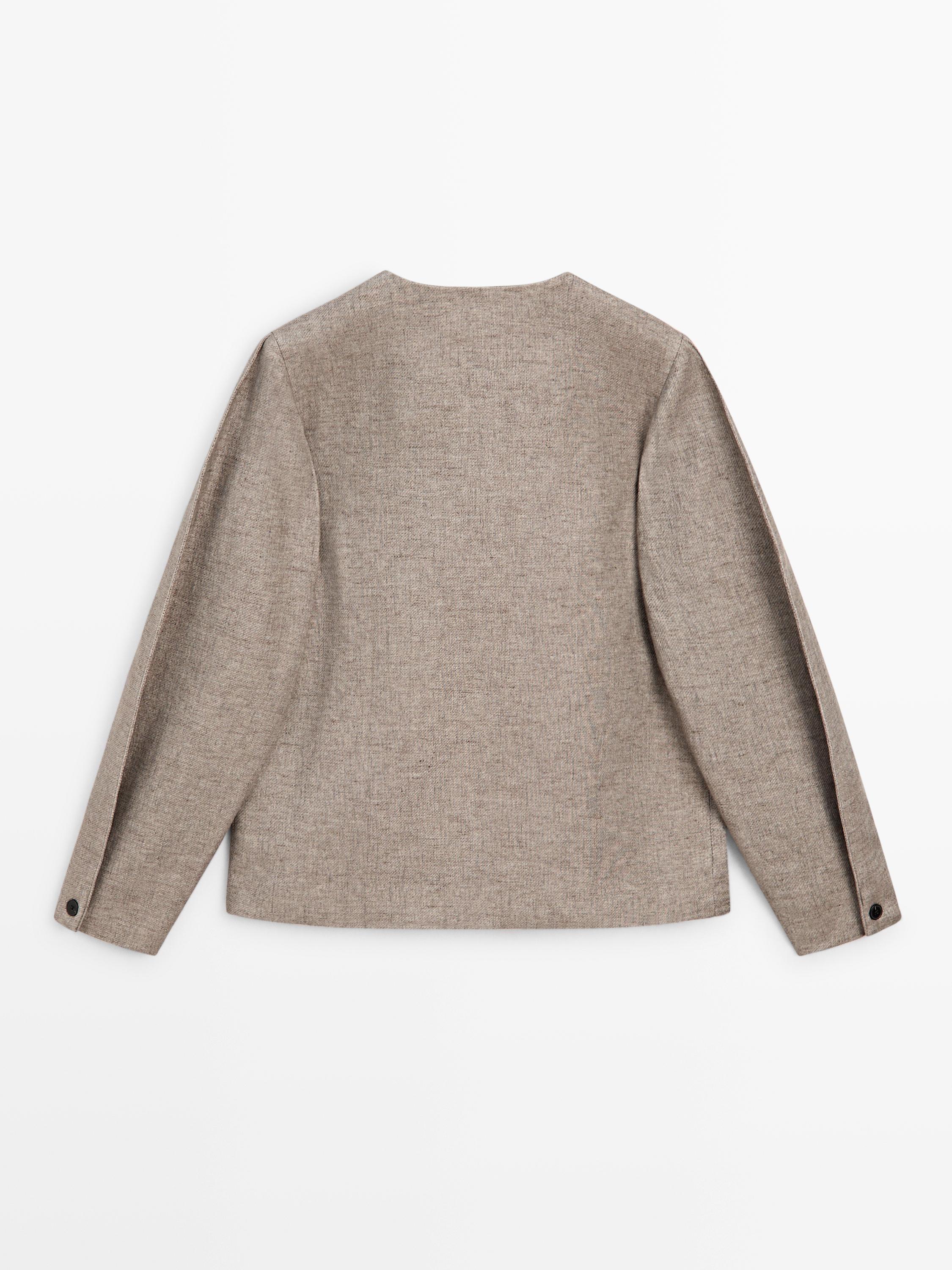 Jacket made of a linen blend fabric. V-neck. Long sleeves. Buttoned cuffs. Cotton lining.