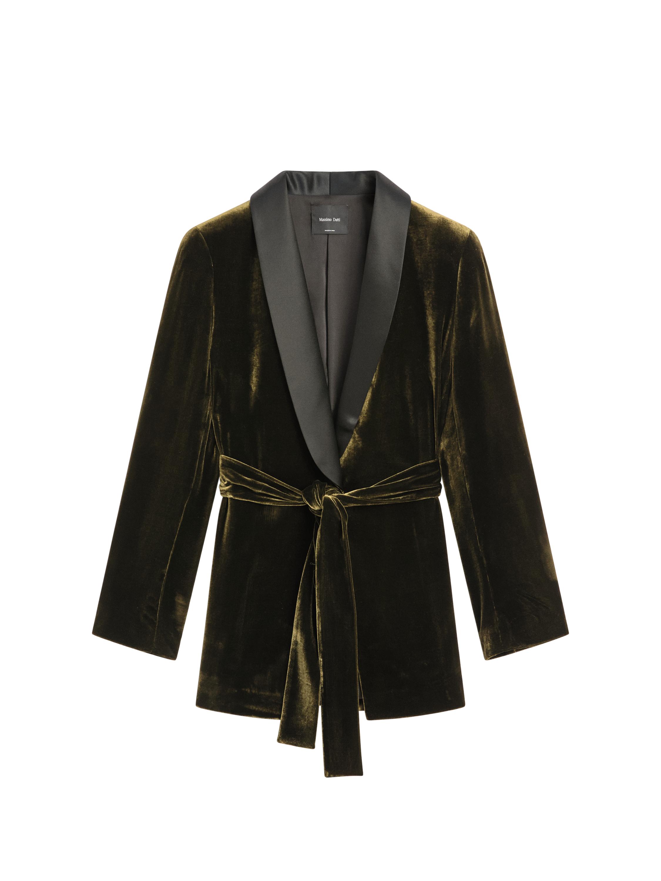 Blazer with tuxedo collar. Long sleeves. Contrast collar detail. Velvet fabric. Bow fastening. Lined. Matching garment available.