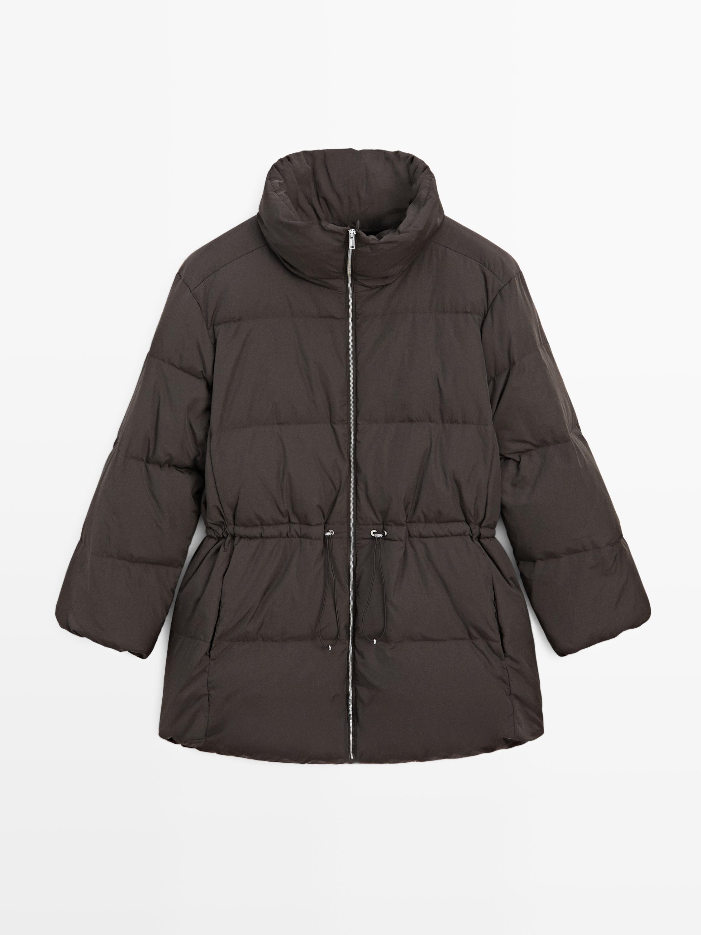 Xhupa me mbushje me pupla dhe pendë. Jakë e lartë. Mëngë të gjata me llastikë. Mbërthim me zinxhir. Adjustable elastic waistband. Dy xhepa anësor. Pëlhurë kundër ujit.