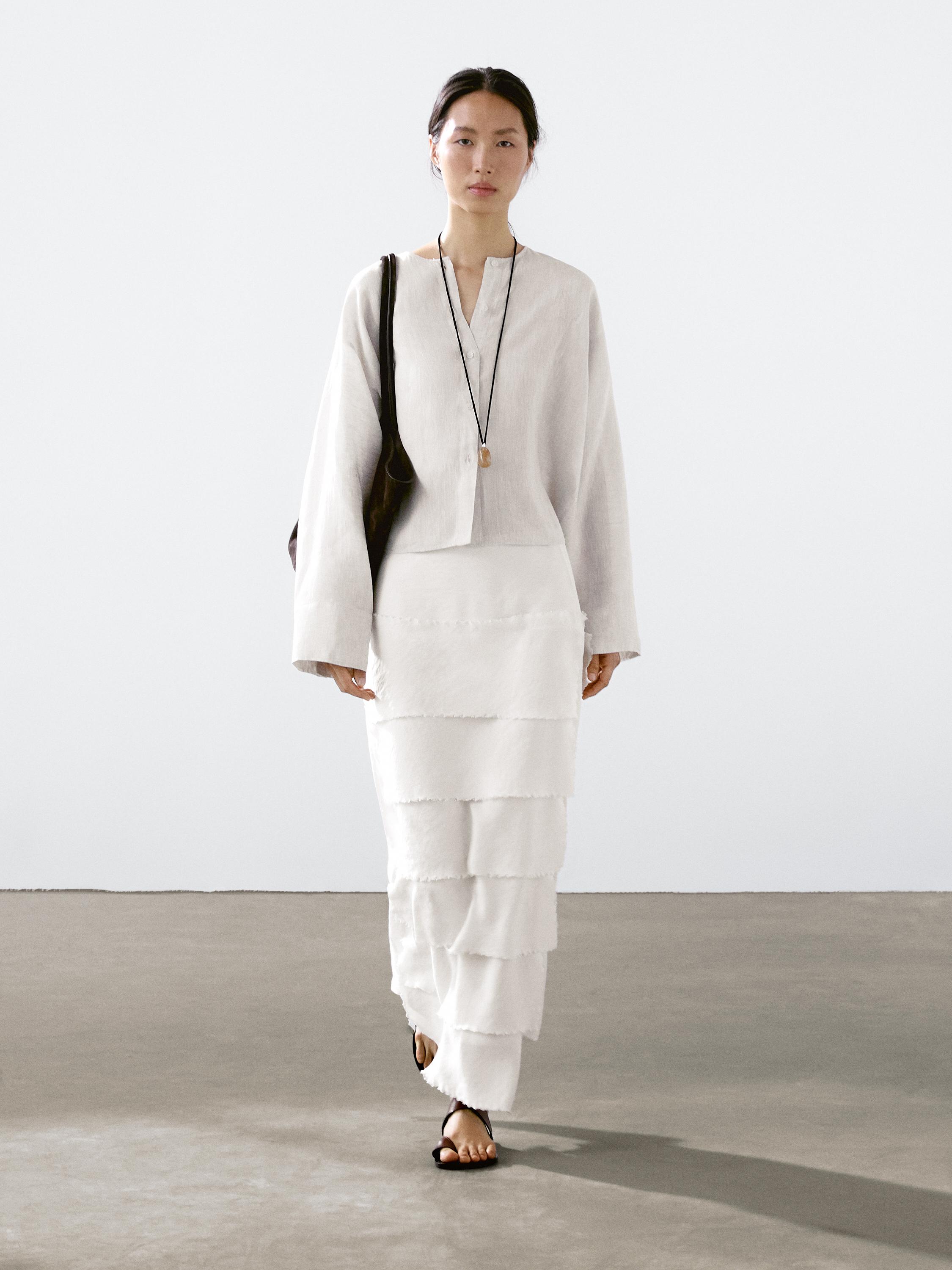 Рубашка из 100% льна. Длинные рукава и манжеты на пуговицах. Круглый вырез. Застежка на пуговицы спереди. Струящаяся ткань. Широкий и свободный силуэт, не облегающий.