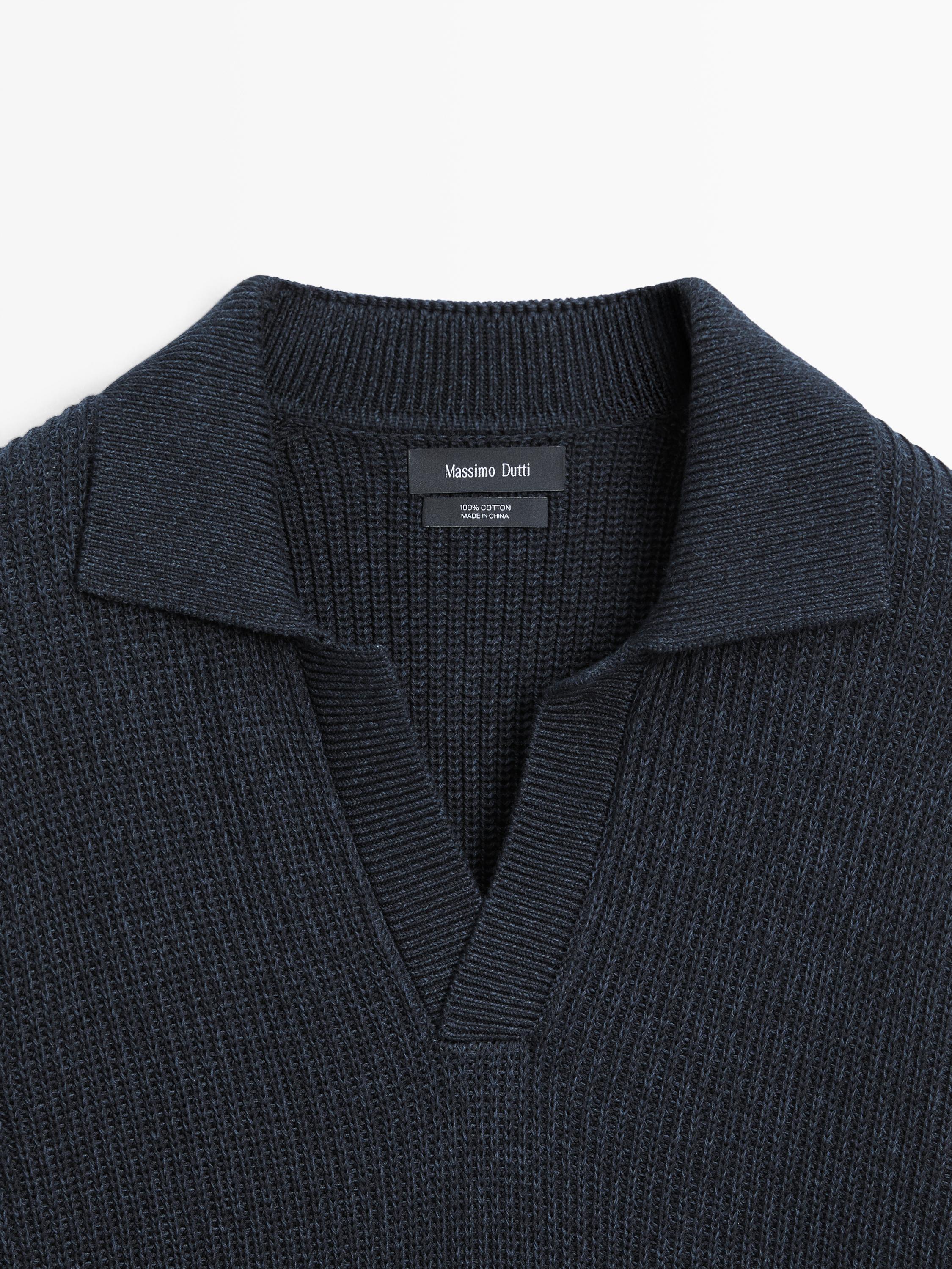 Трикотажный свитер из 100% хлопка . Классический воротник с V-образным вырезом. Длинные рукава. Детали в рубчик . Модель из двухцветной пряжи мулине..