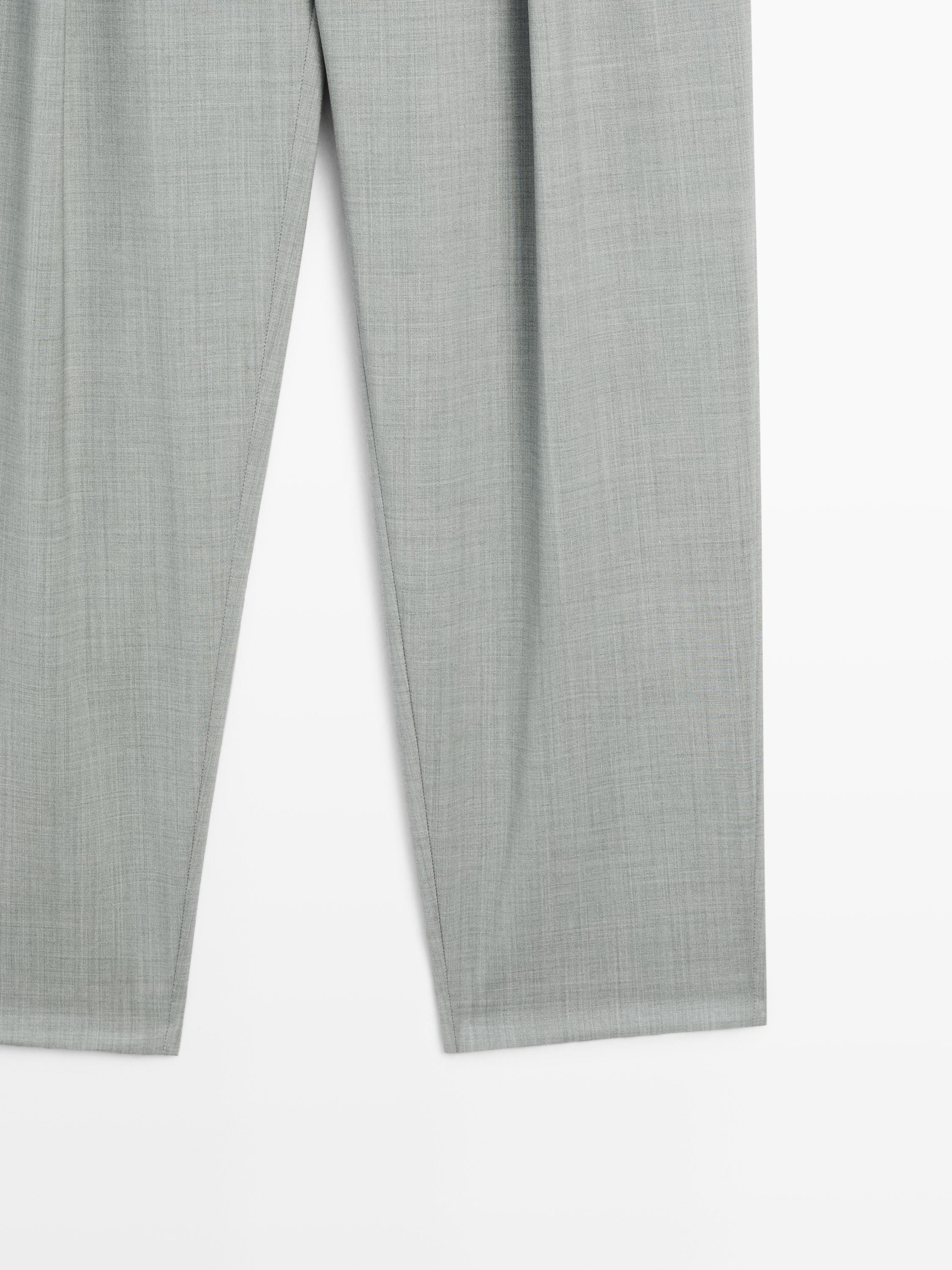 Hlače s ušicima. Pojas s petljama za remen . Kopčanje sprijeda patentnim zatvaračem i gornjim gumbom. Dva bočna džepa.