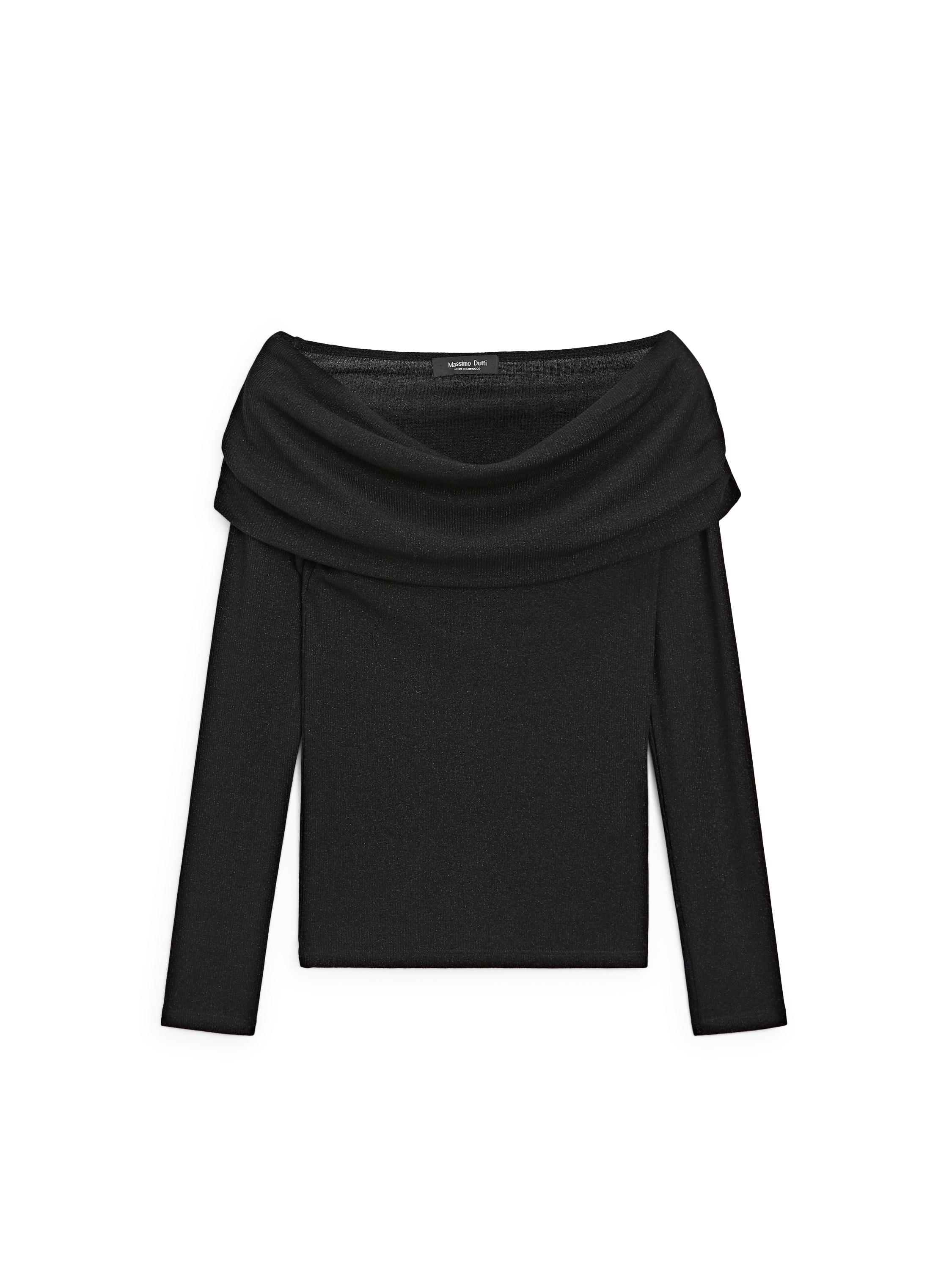 Langarmshirt. Feine Laméfäden . Schulterfrei. Raffungen hinten . Rippenstrick-Gewebe.