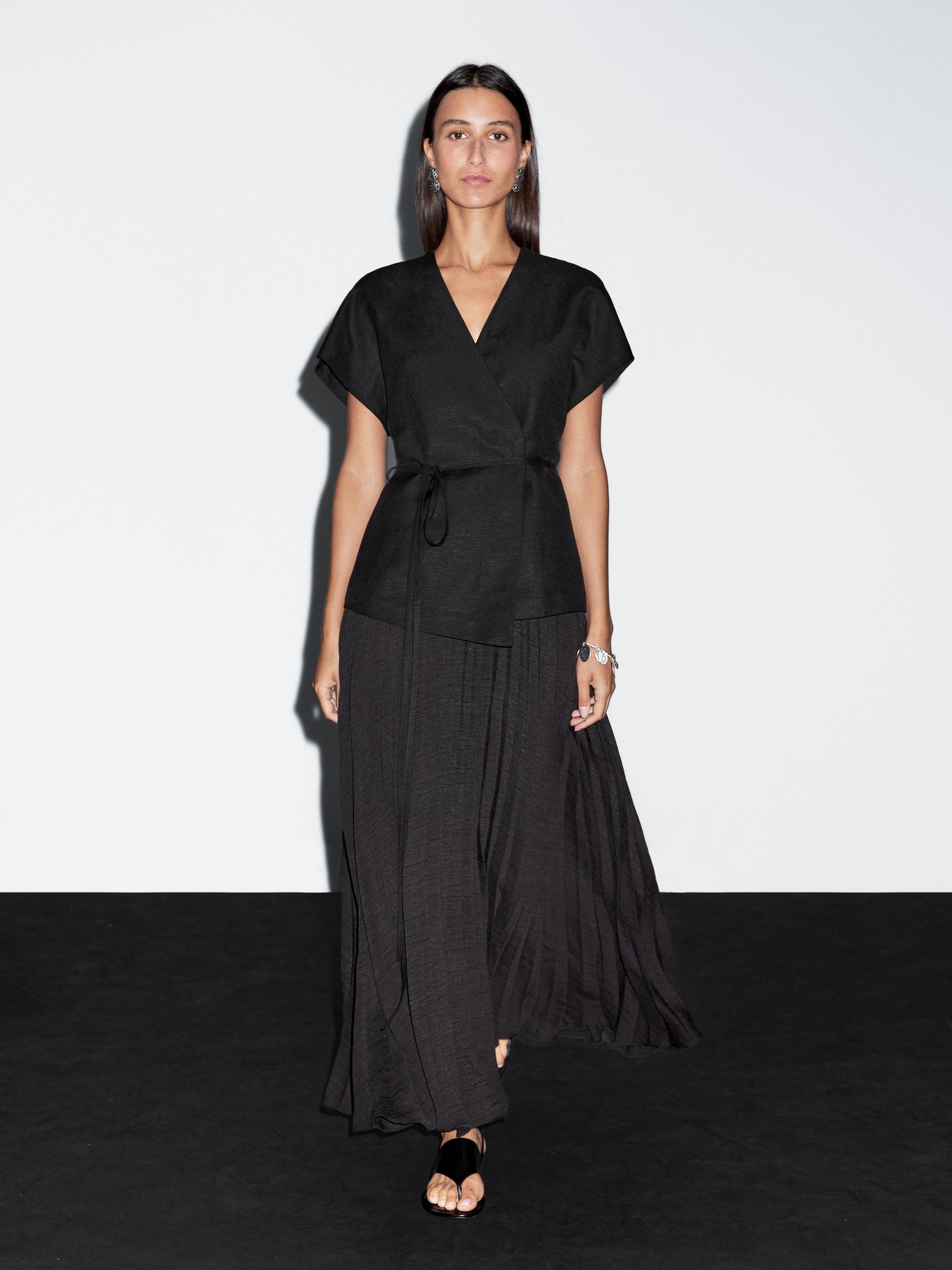 Robe longue avec jupe plissée et veste sans manches cache-cœur. Col en V . Épaules tombantes. Fermeture à l’aide d’un bouton dissimulé. Fermeture croisée avec un nœud. Doublure intérieure. Ceinture comprise.