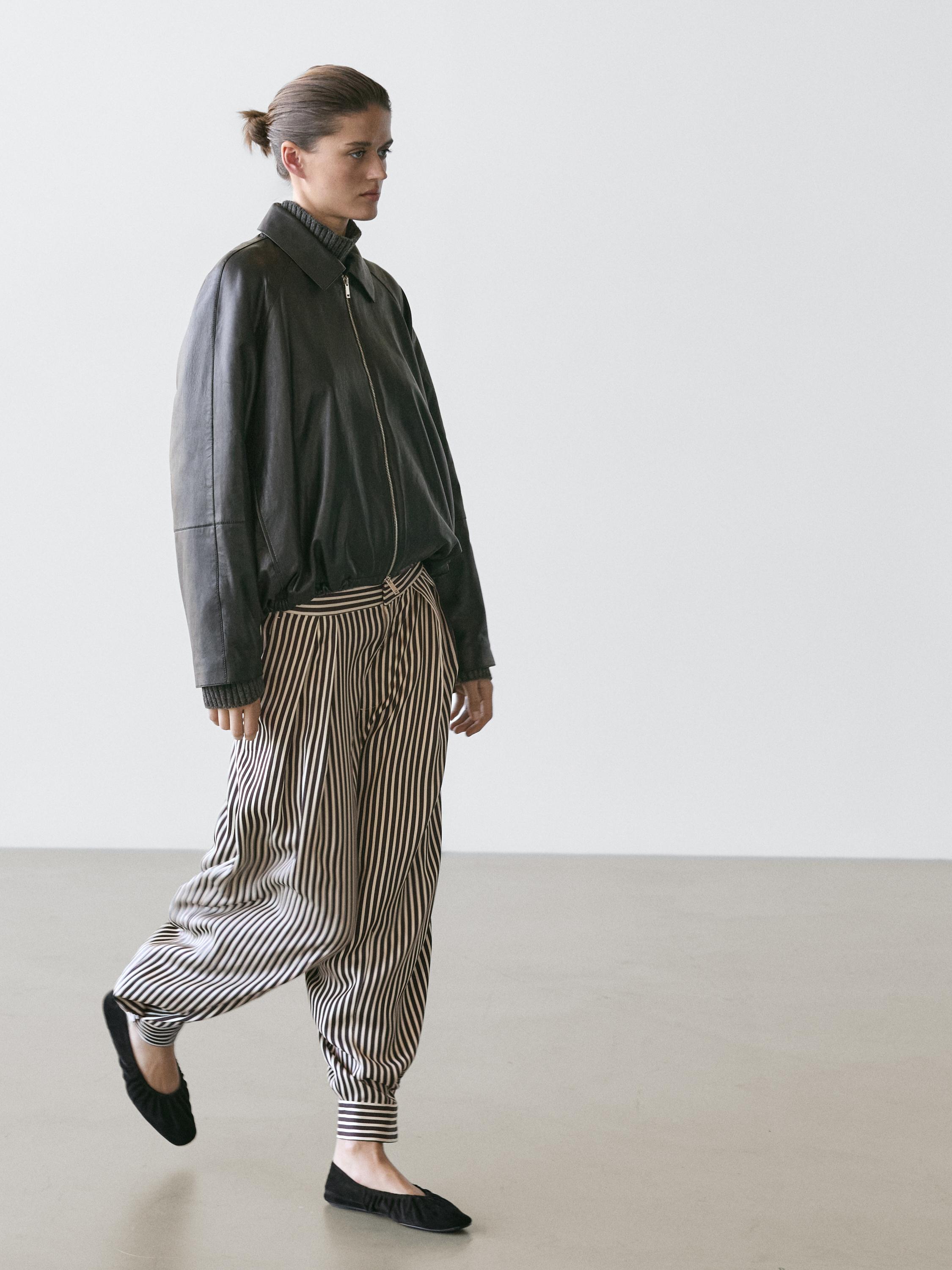 Pofbroek: losvallend silhouet, wijde pijpen en strak aan de enkel.. Verborgen rits- en haakjessluiting. Twee steekzakken. Plooi aan de voorzijde. Streepjesprint.