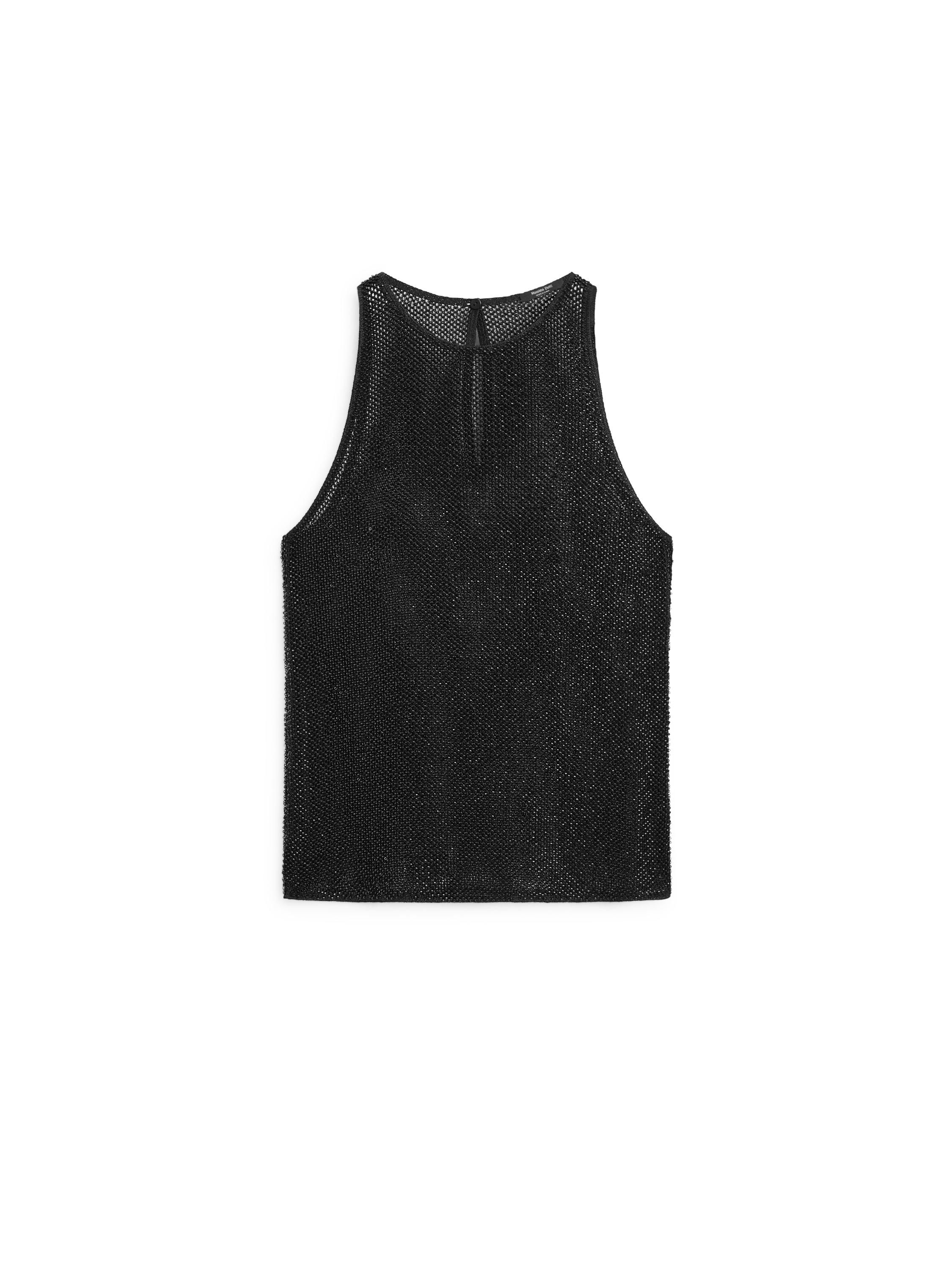 Топ, изработен от тъкан с комбинирани мъниста. Обло деколте. Без ръкав. Капковиден шлиц с копче на гърба. Полупрозрачна тъкан.