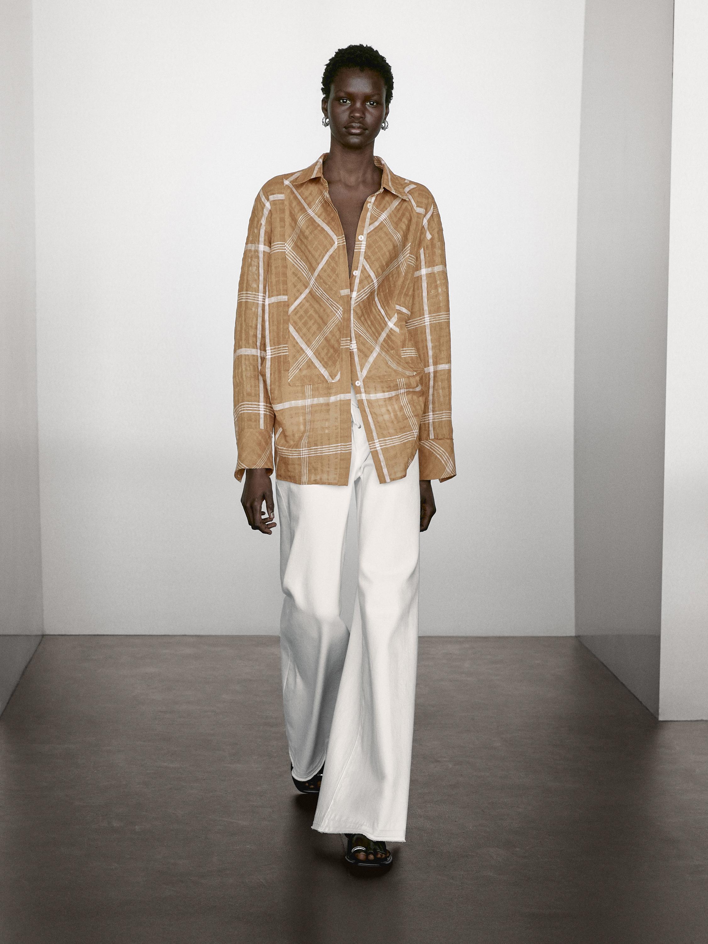 Flowing shirt made of linen blend fabric. Long sleeves with buttoned cuffs. Shirt collar. Frayed finish. Check print. Textured. Wide and relaxed silhouette, not tailored.