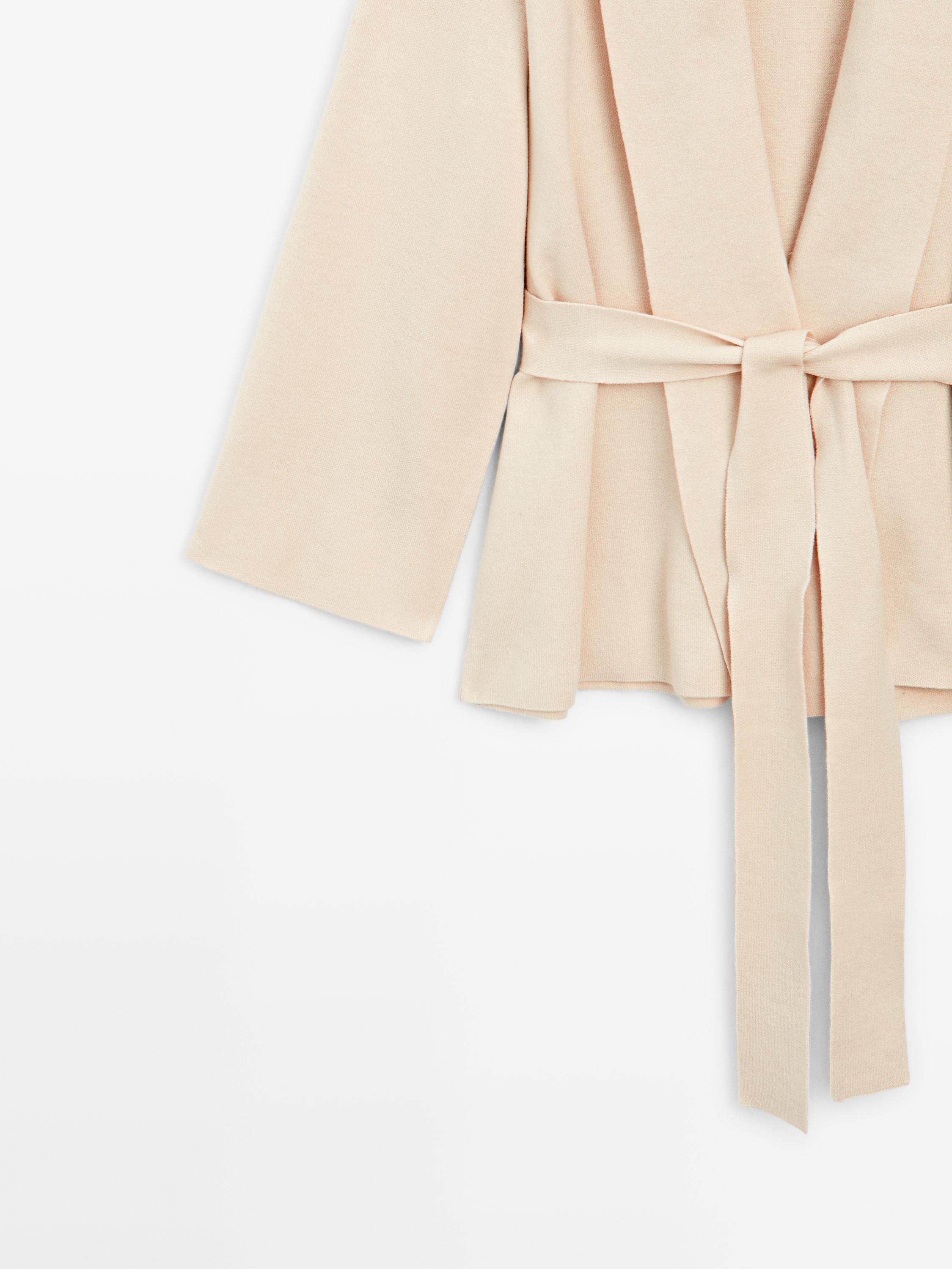 Knit cardigan. Wraparound collar. Long sleeves. Includes belt.
