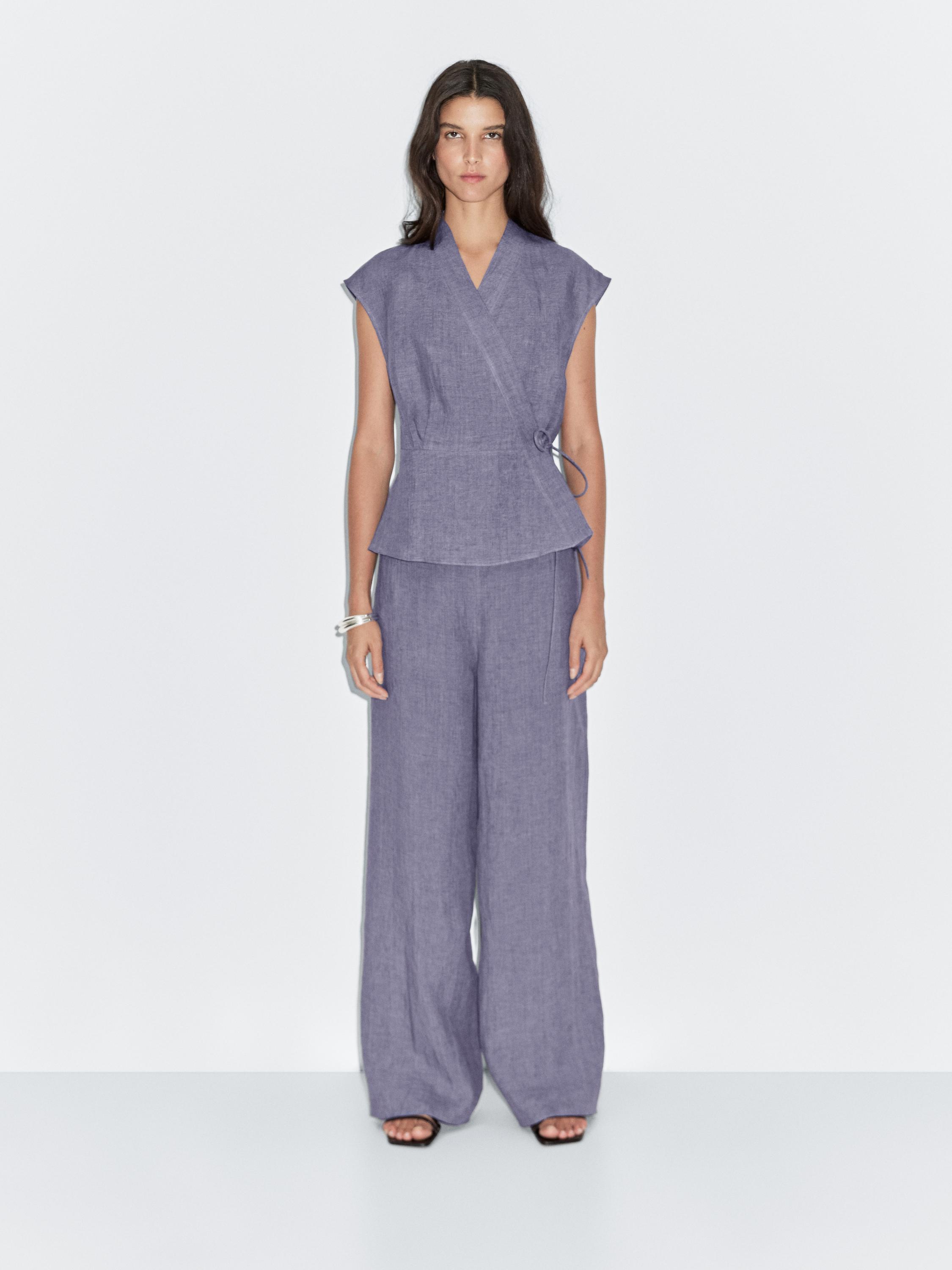 Waistcoat made of 100% linen fabric . V-neck . Wrap-style fastening with ties. Darted detail on the front. Matching garment available.