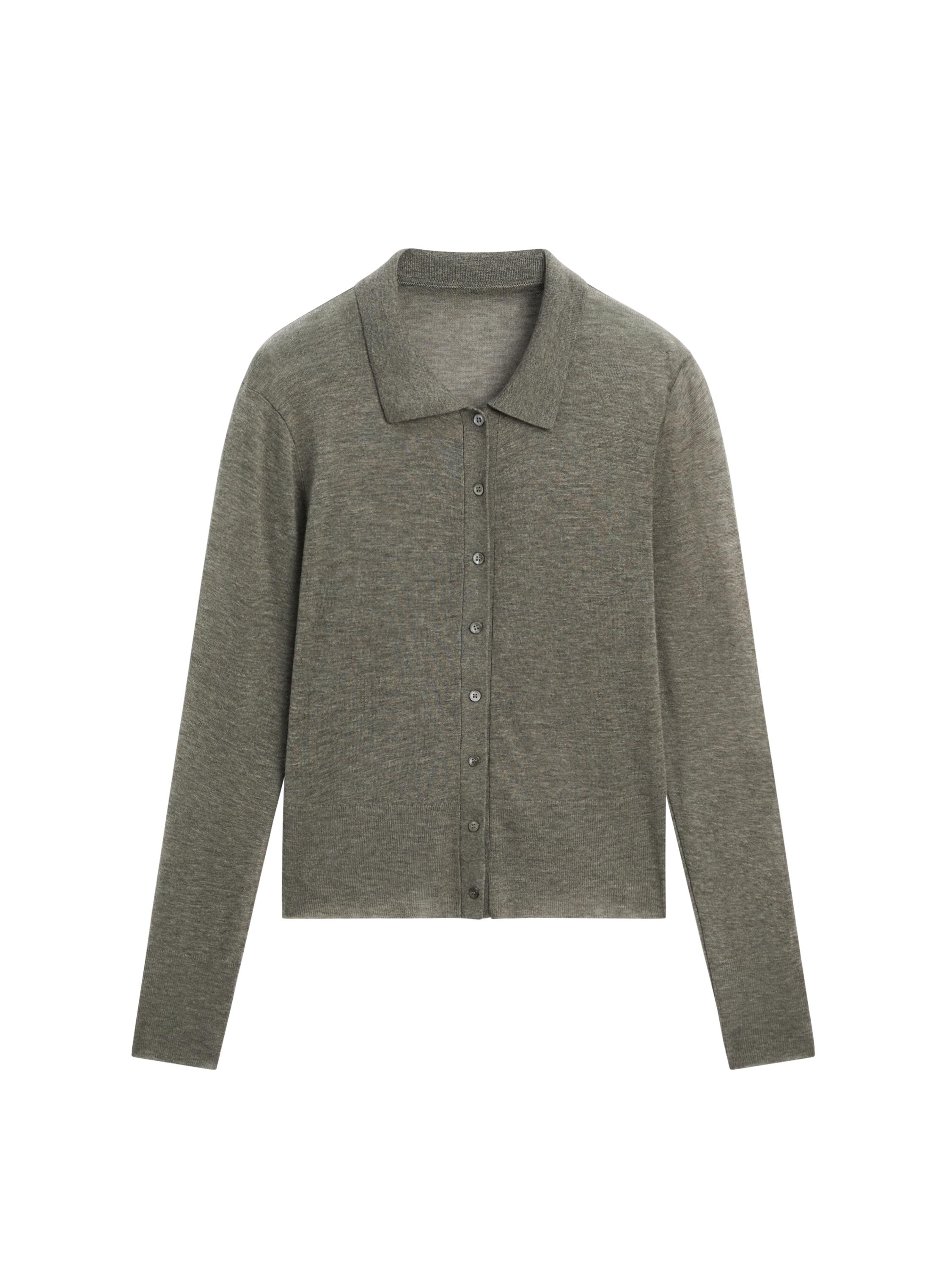 Cardigan made of 100% wool fabric. Long sleeves. Button-up front. Polo Collar. Ribbed trims . Fine, lightweight fabric.
