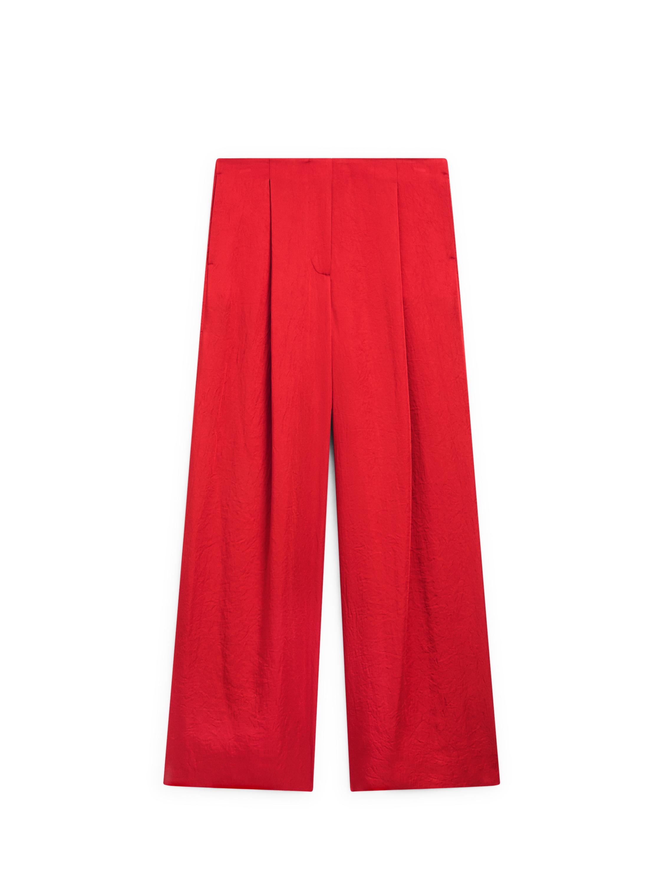 Wide-leg trousers in a flowing fabric. Satin finish. Zip and hook-and-eye fastening with inside button . Two side pockets. Darted detail on the front. Matching garment available.