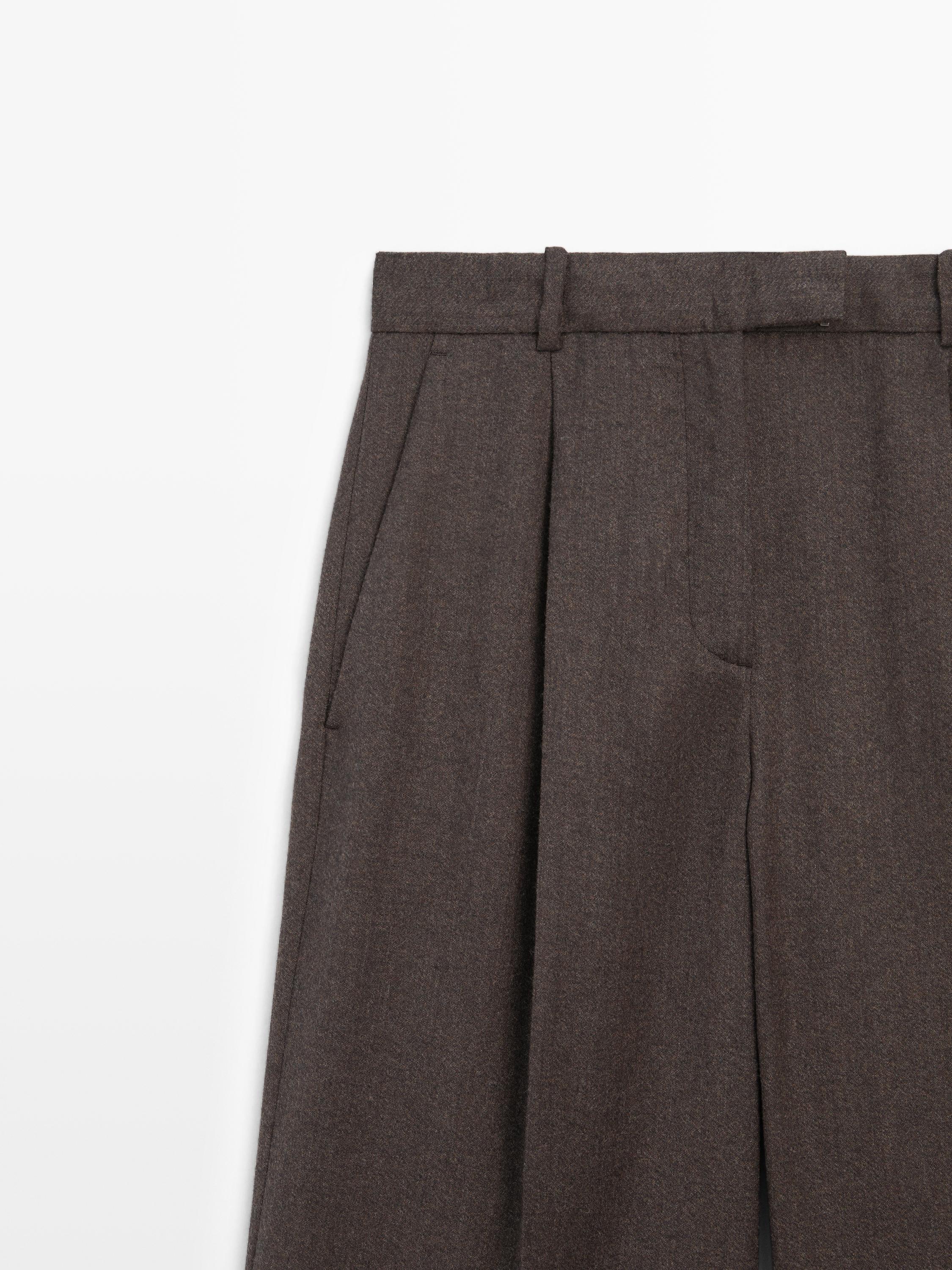 Pantalon 100 % laine. Fermeture Éclair dissimulée par patte, bouton et lien avec crochet. Une poche passepoilée à l’arrière. Pinces sur le devant.