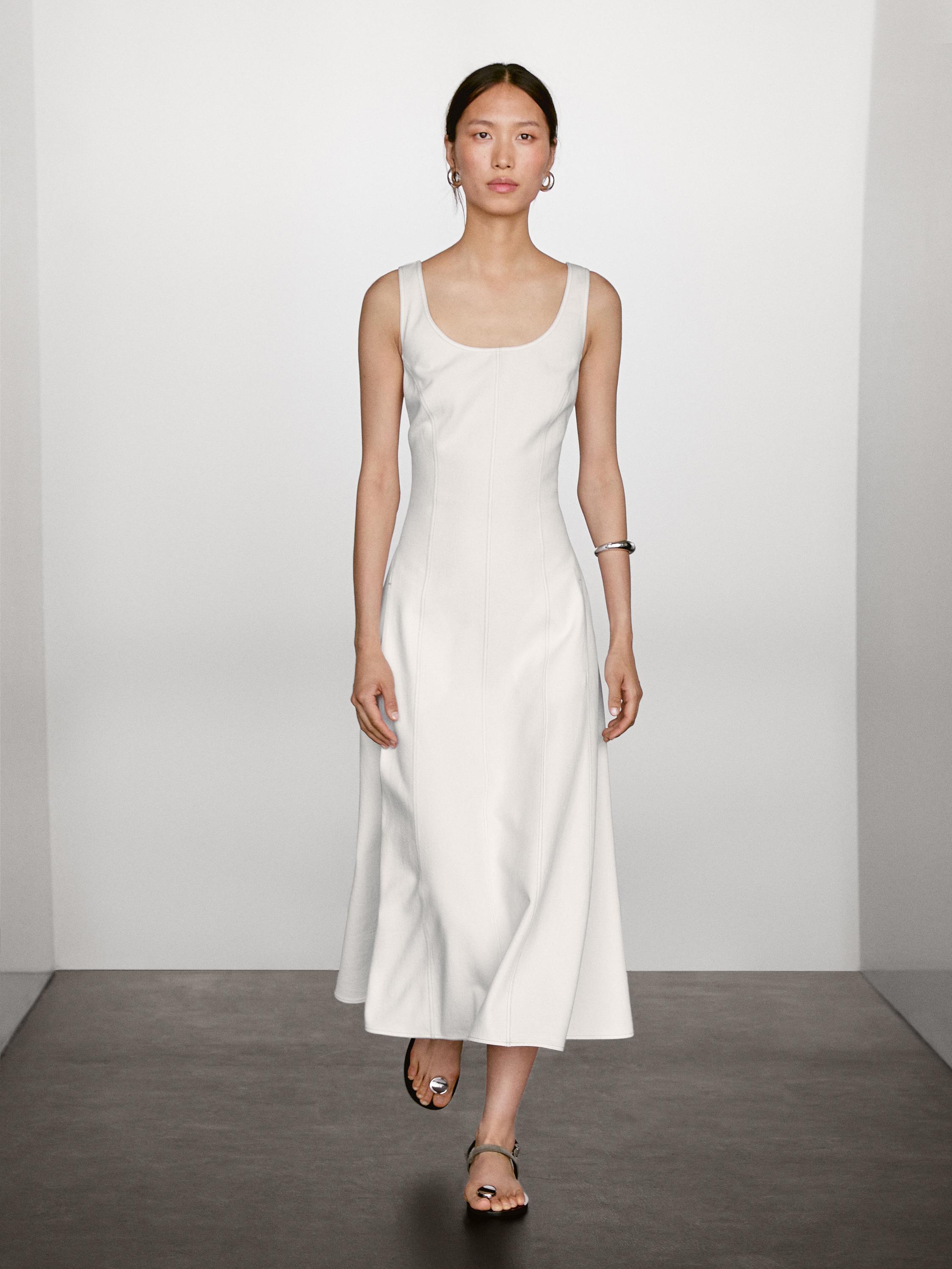 Robe midi en denim 100 % coton. Col rond sur le devant et dans le dos. Sans manches. Fermeture éclair à l'arrière. Deux poches sur les côtés. Coutures visibles .