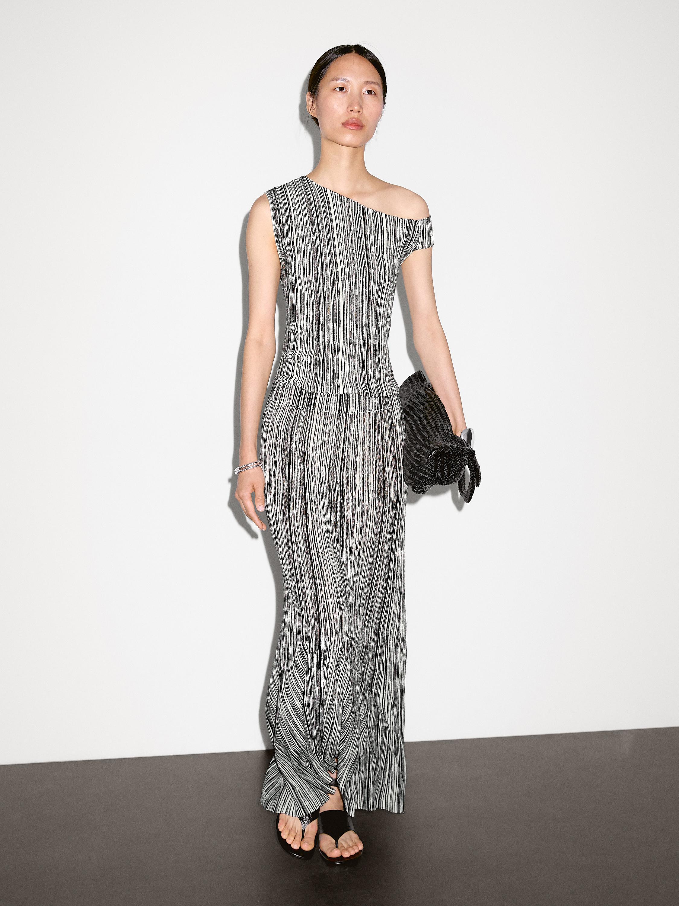 Falda larga confeccionada en tejido de punto. Cintura elástica lisa. Estampado de rayas. Dispone de prenda a conjunto.