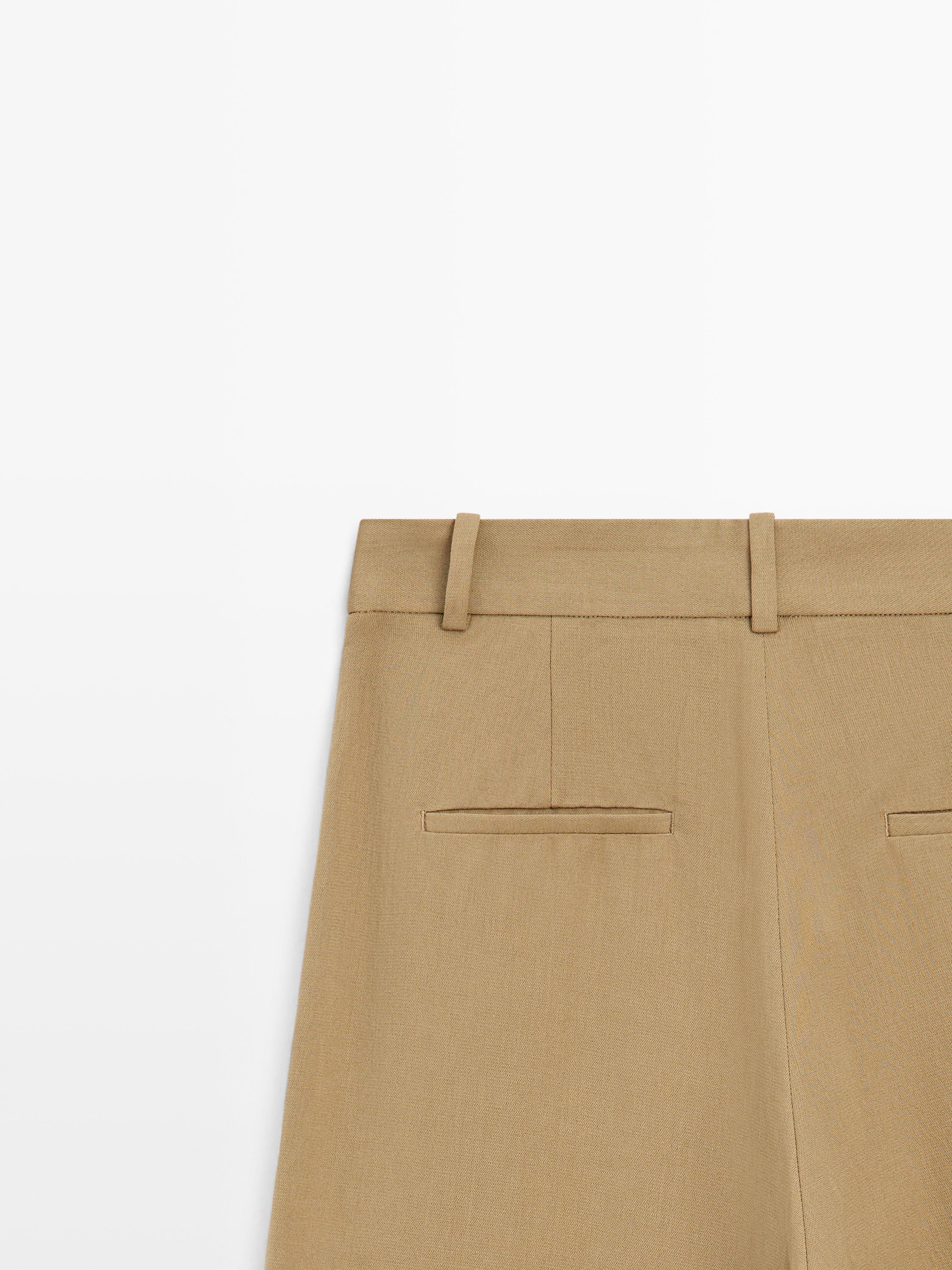 Pareo kalhoty . Pasový límec s poutky na pásek . Zapínání na skrytý zip, pásek s knoflíkem, háček a vnitřní knoflík.. Dvě postranní kapsy. Detail záševků na předním díle.