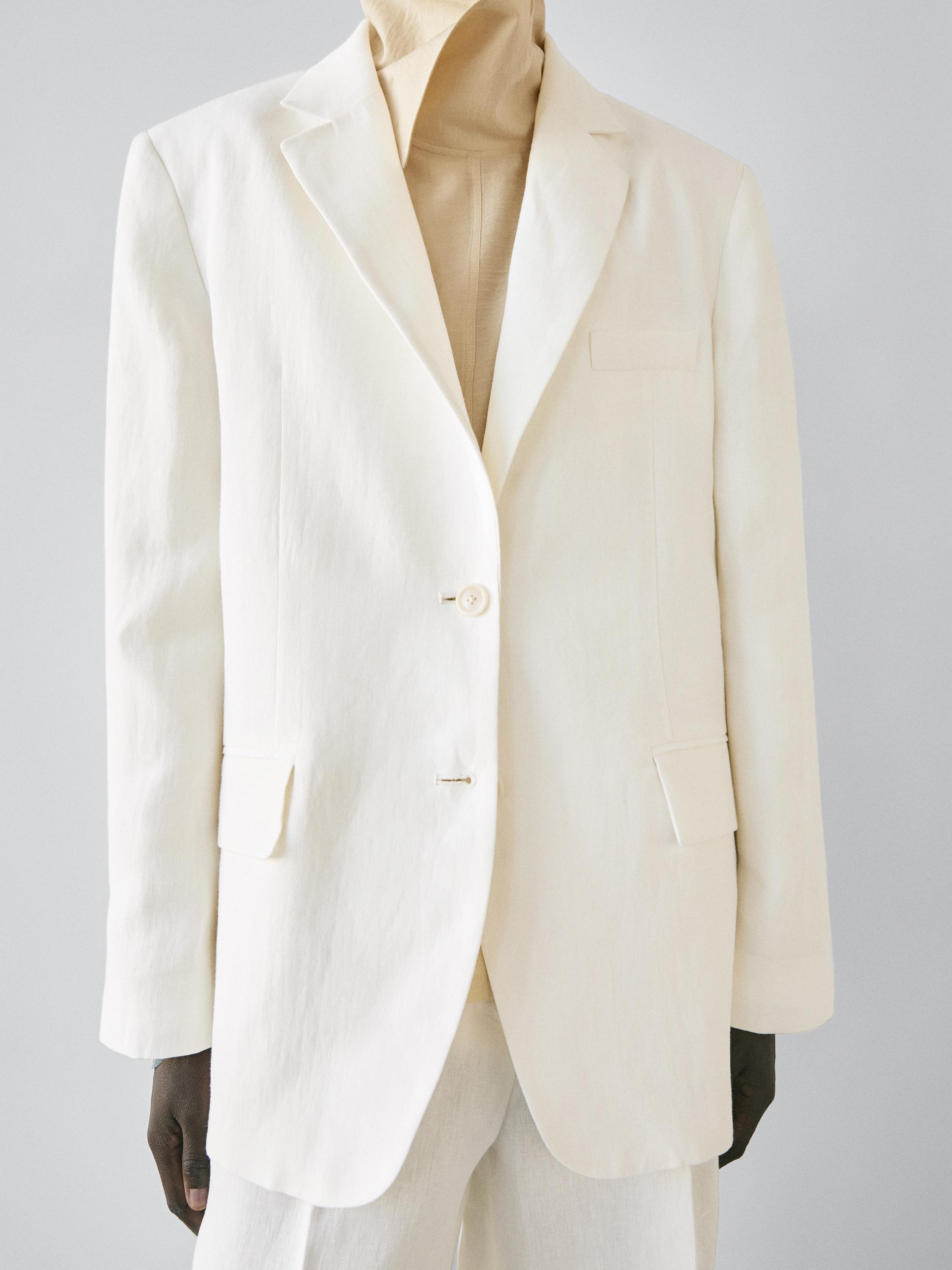 Blazer aus reinem Leinen. Reverskragen. Lange Ärmel. Zwei-Knopf-Verschluss. Zwei aufgesetzte Pattentaschen. Zwei eingesetzte Knopflochtaschen auf Brusthöhe. Innenfutter. Dieses Kleidungsstück ist Teil eines Anzugs.