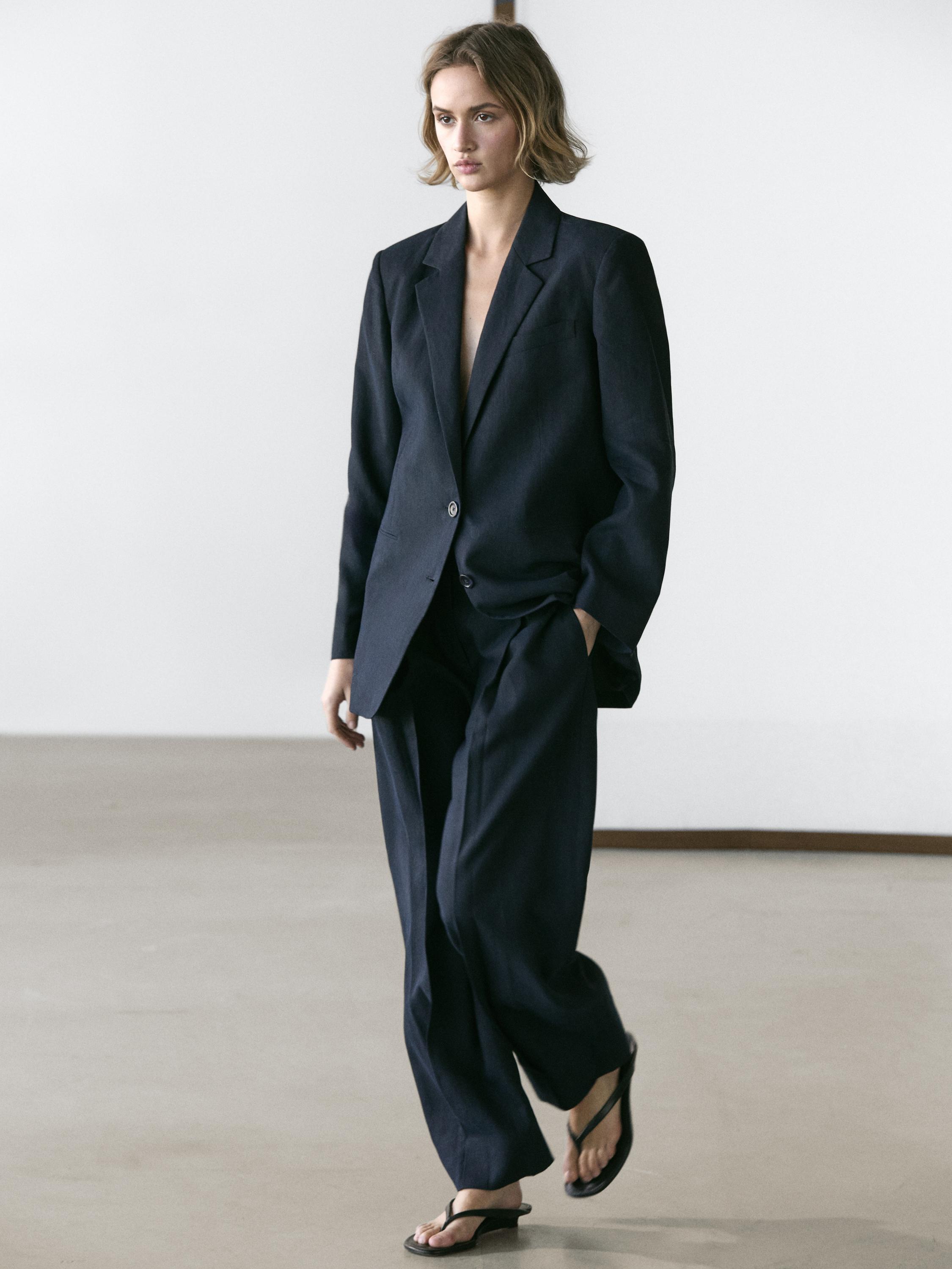 Anzughose aus 100% Leinen. Bund mit Gürtelschlaufen . Reißverschluss und Knopfverschluss vorne. Zwei Seitentaschen. Dieses Kleidungsstück ist Teil eines Anzugs.