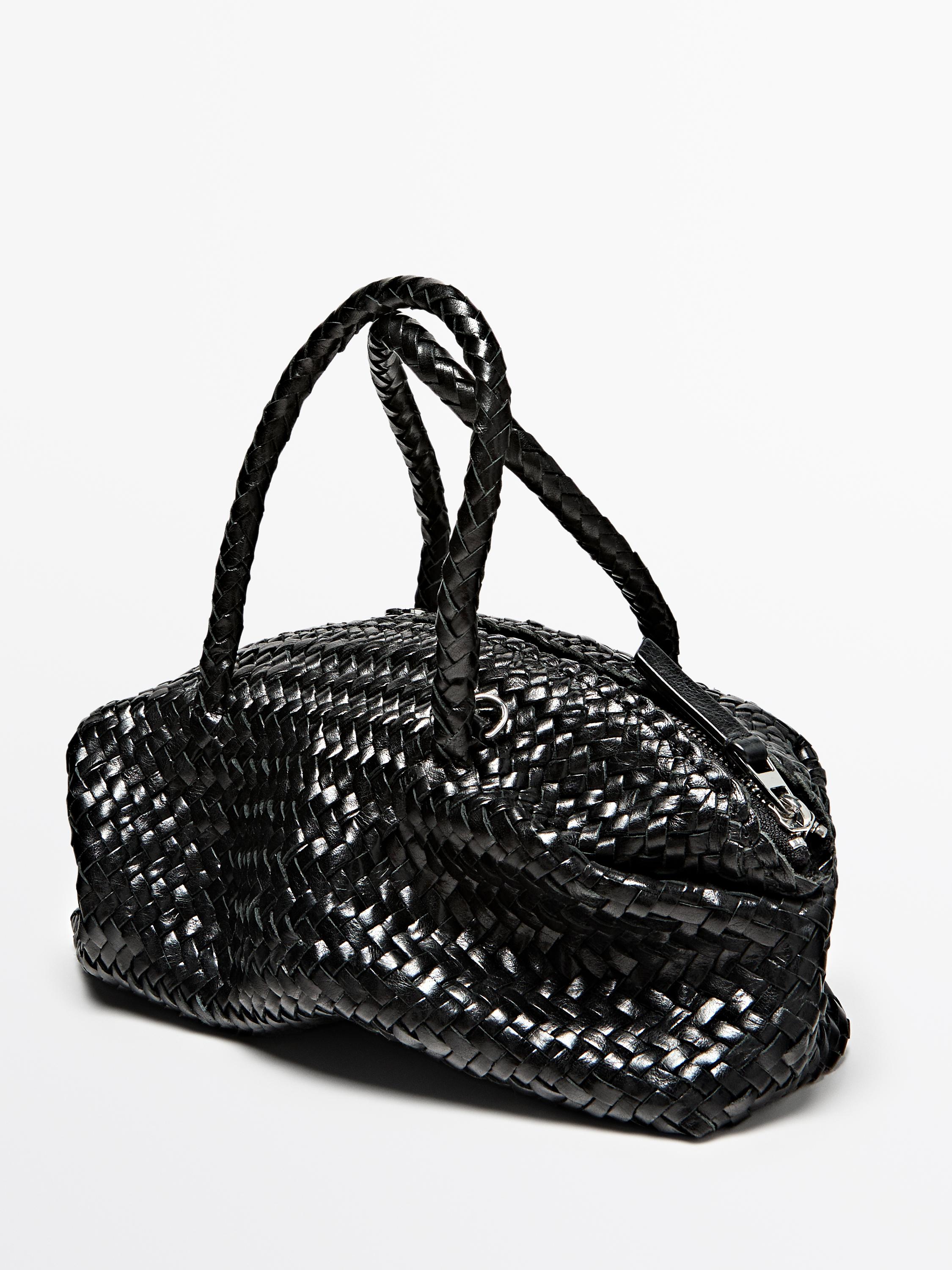 Håndtaske fremstillet af koskindslæder . One carry handle and one detachable, adjustable shoulder strap. Lukning med lynlås. Bomuldsfor. Braided detail.