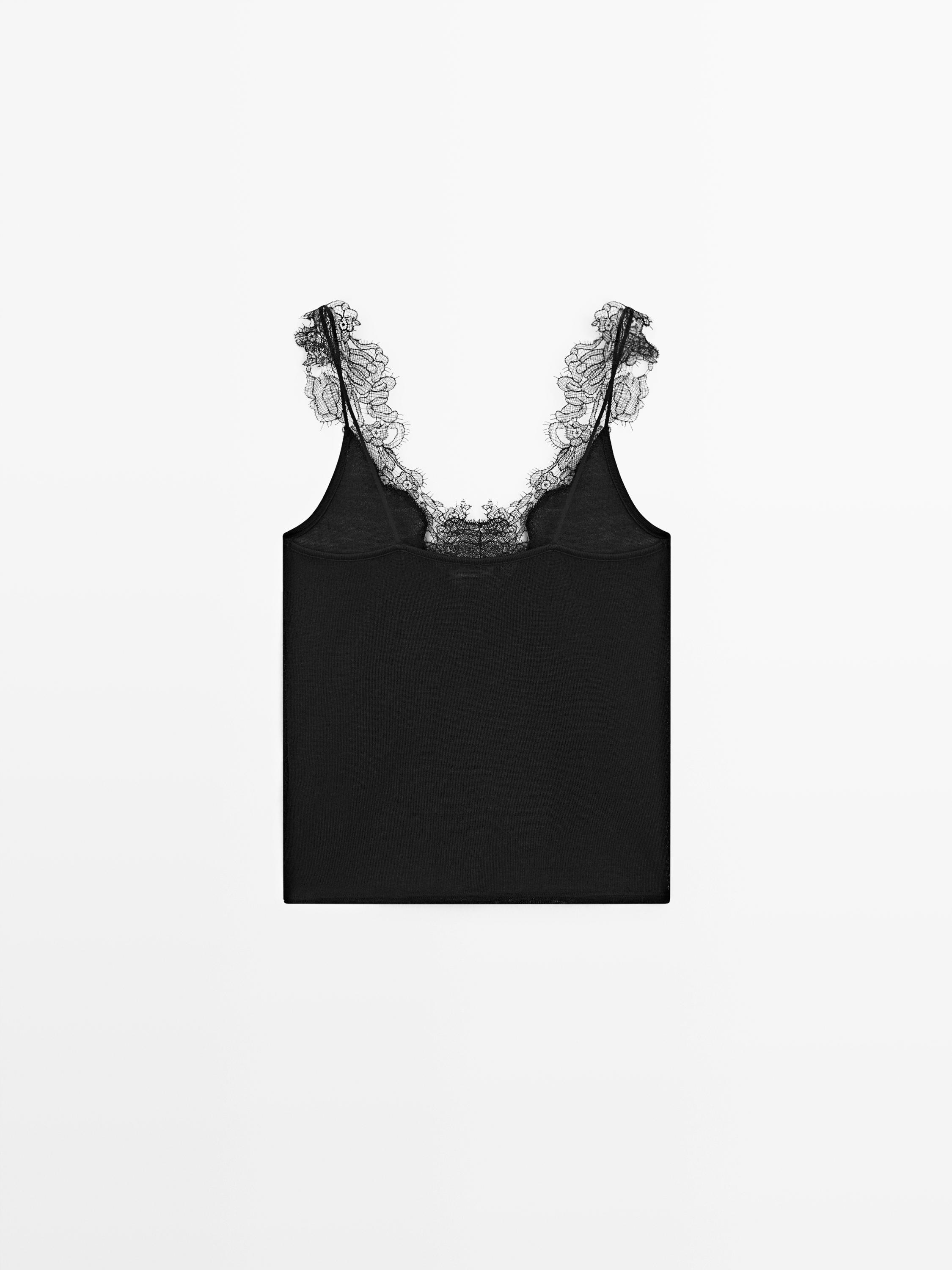Striktop fremstillet af en uldblanding. Stropper. Detalje med blondebort . Gennembrudt stof .