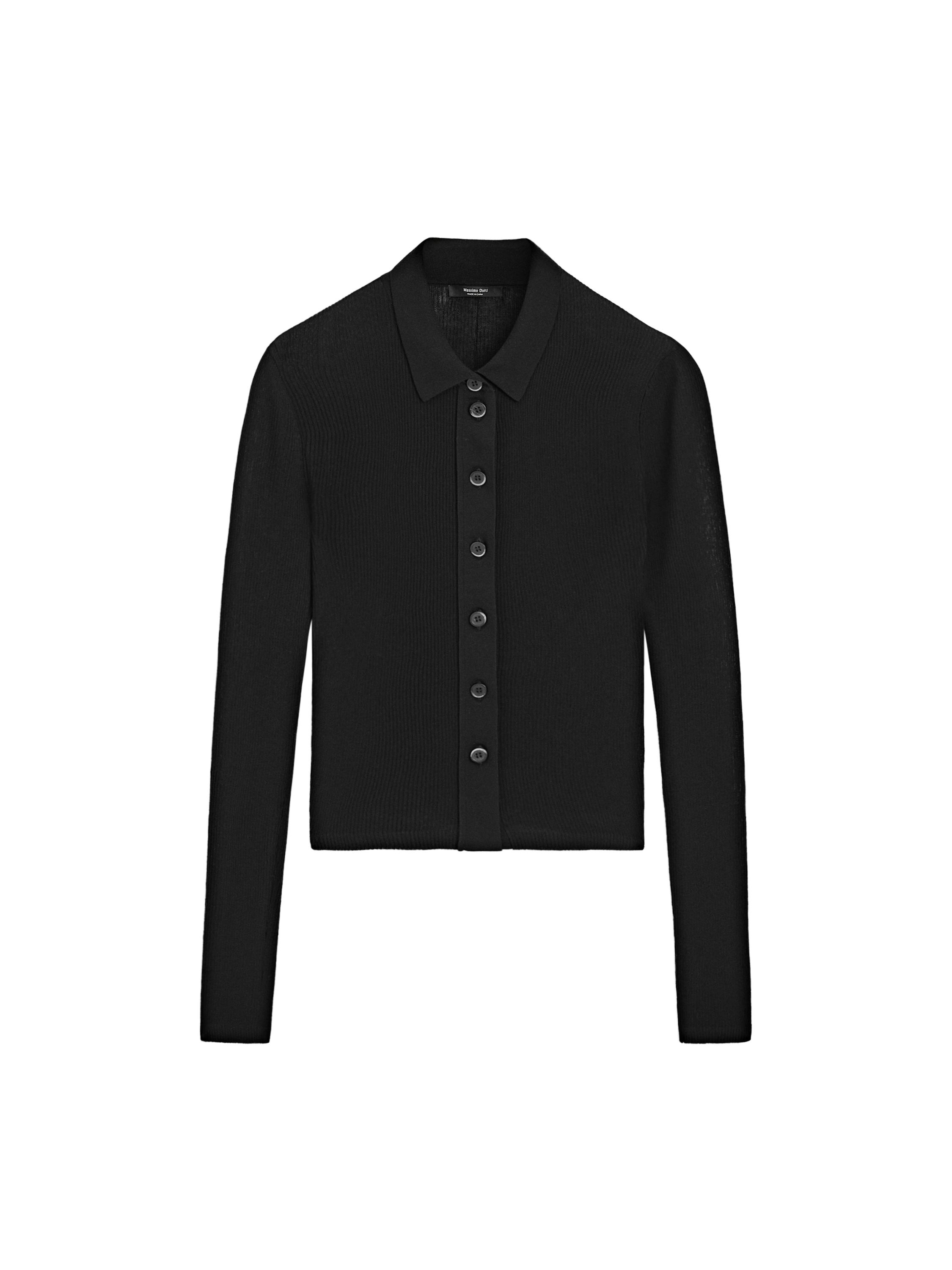 Cárdigan confeccionado con tejido de punto en mezcla de algodón. Silueta ligeramente ajustada al cuerpo, proporcionando un aspecto más definido y estilizado. Manga larga. Cierre mediante botonadura frontal. Cuello tipo polo. Detalle de acabados en tejido semitransparente. Tejido de punto rib.