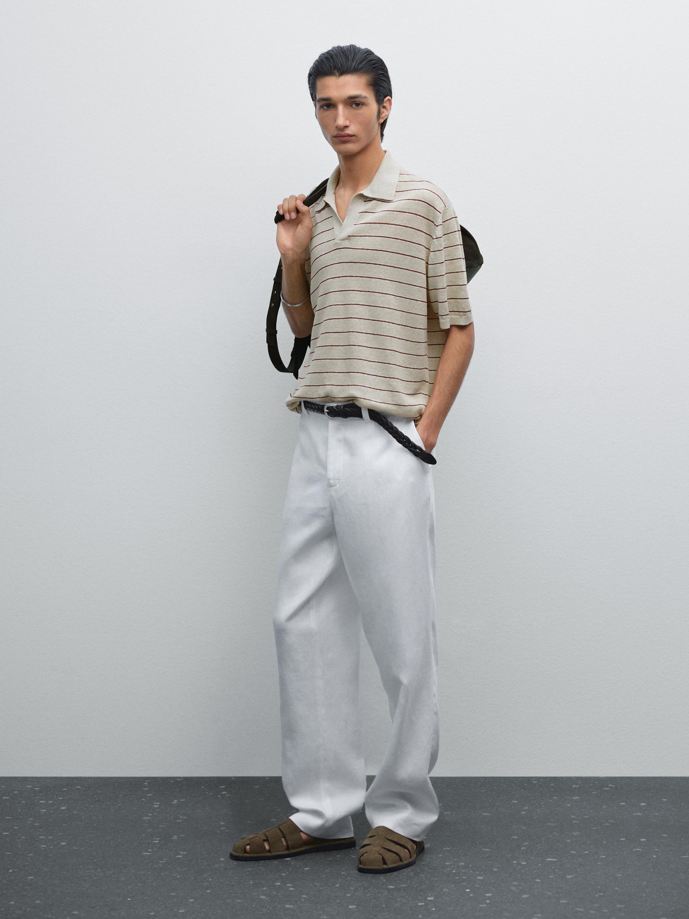 قميص بولو محاك مصنوع من قماش كتان 100%. أكمام قصيرة. شريط حاشية مضلع . تفاصيل بخطوط. لباس خفيف .