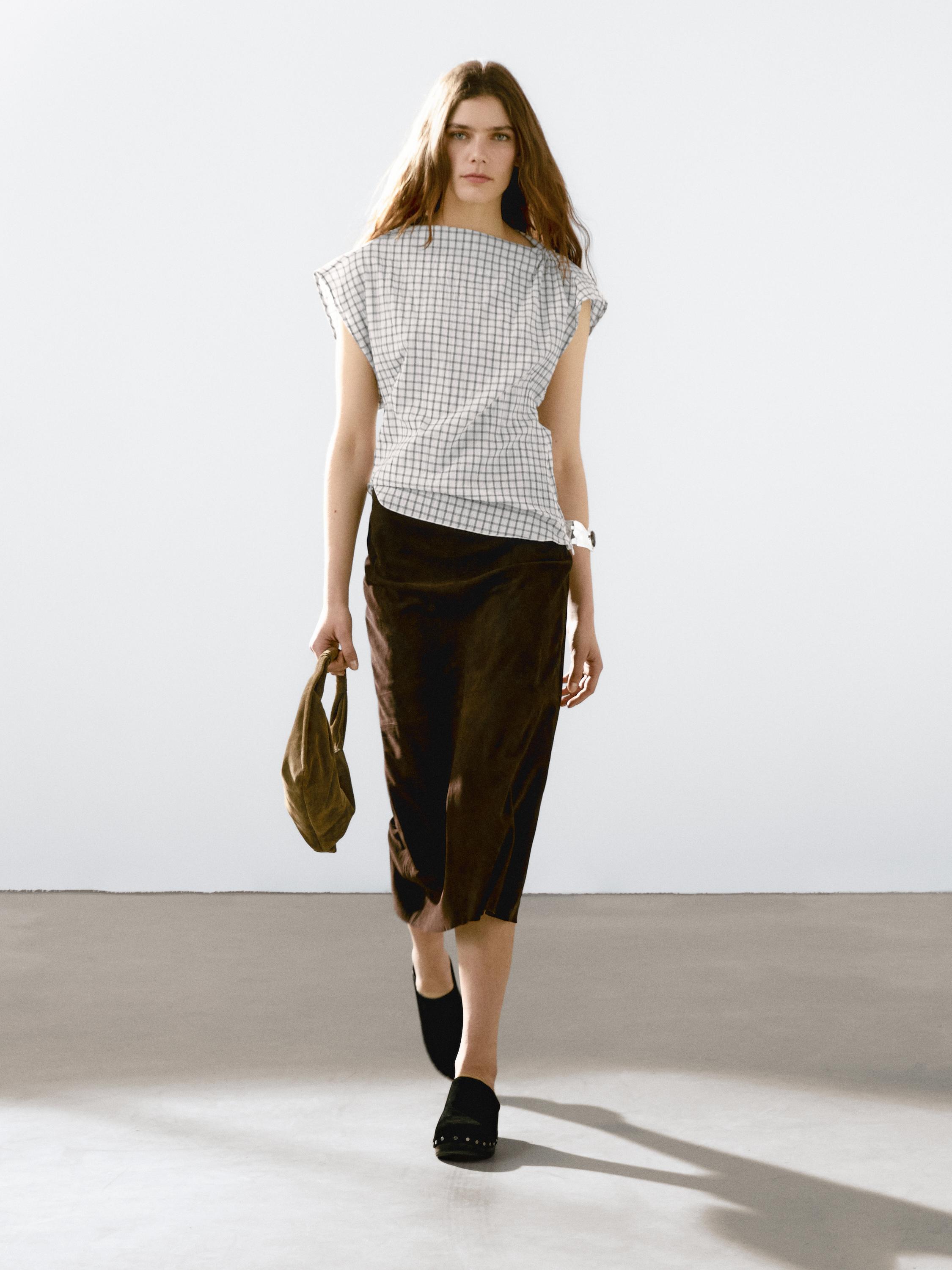 توب مصنوع من قماش قطن مخلوط . طوق بثنيات. بدون أكمام. طبعة بنقشة المربعات. تفصيل حافة غير متماثلة .