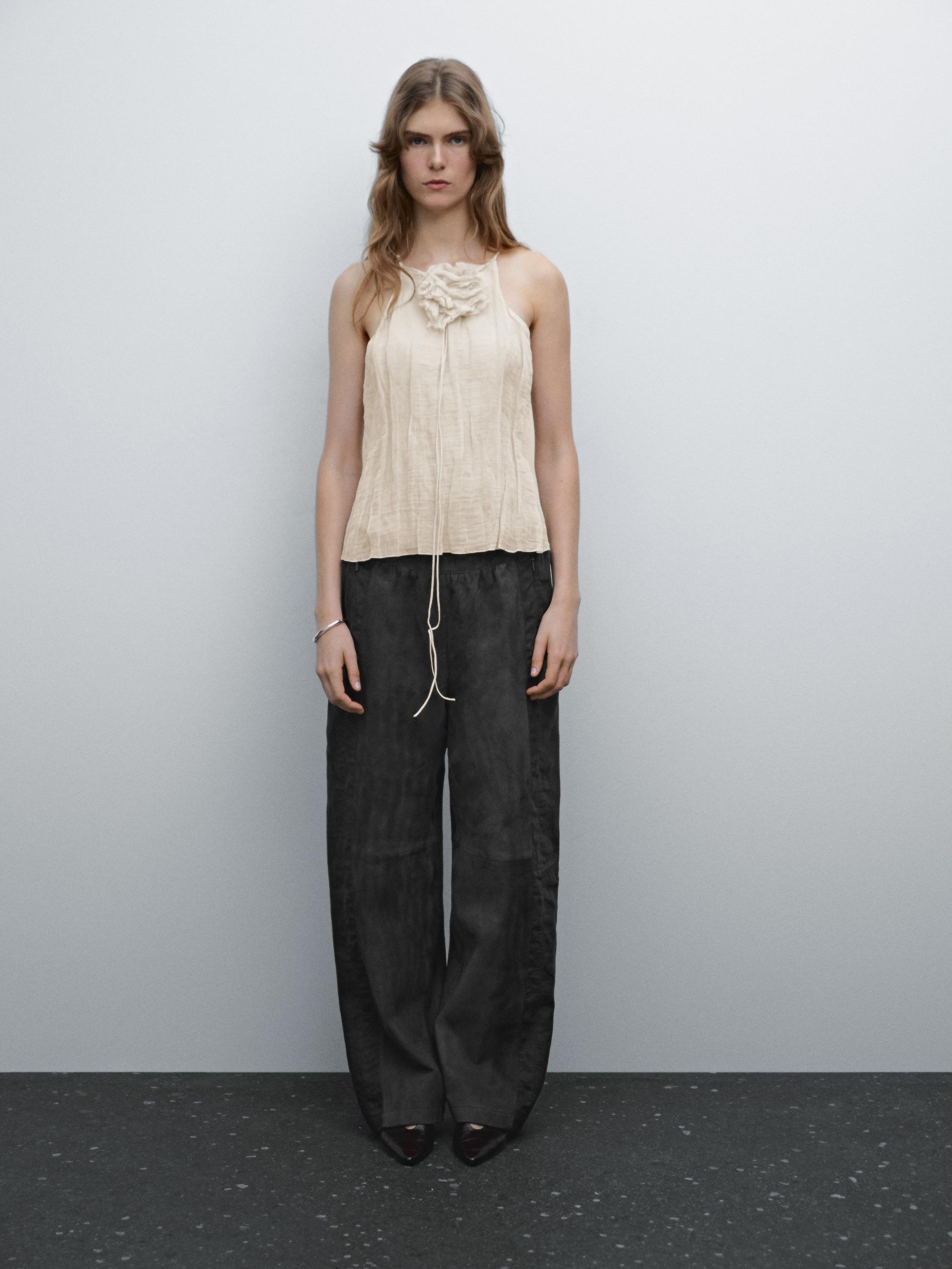 توب مصنوع من قماش قطن مخلوط . ياقة هالتر. تفصيل زهرة. لمسة بمظهر مجعد. خيط معدني. نسيج شبه شفاف.