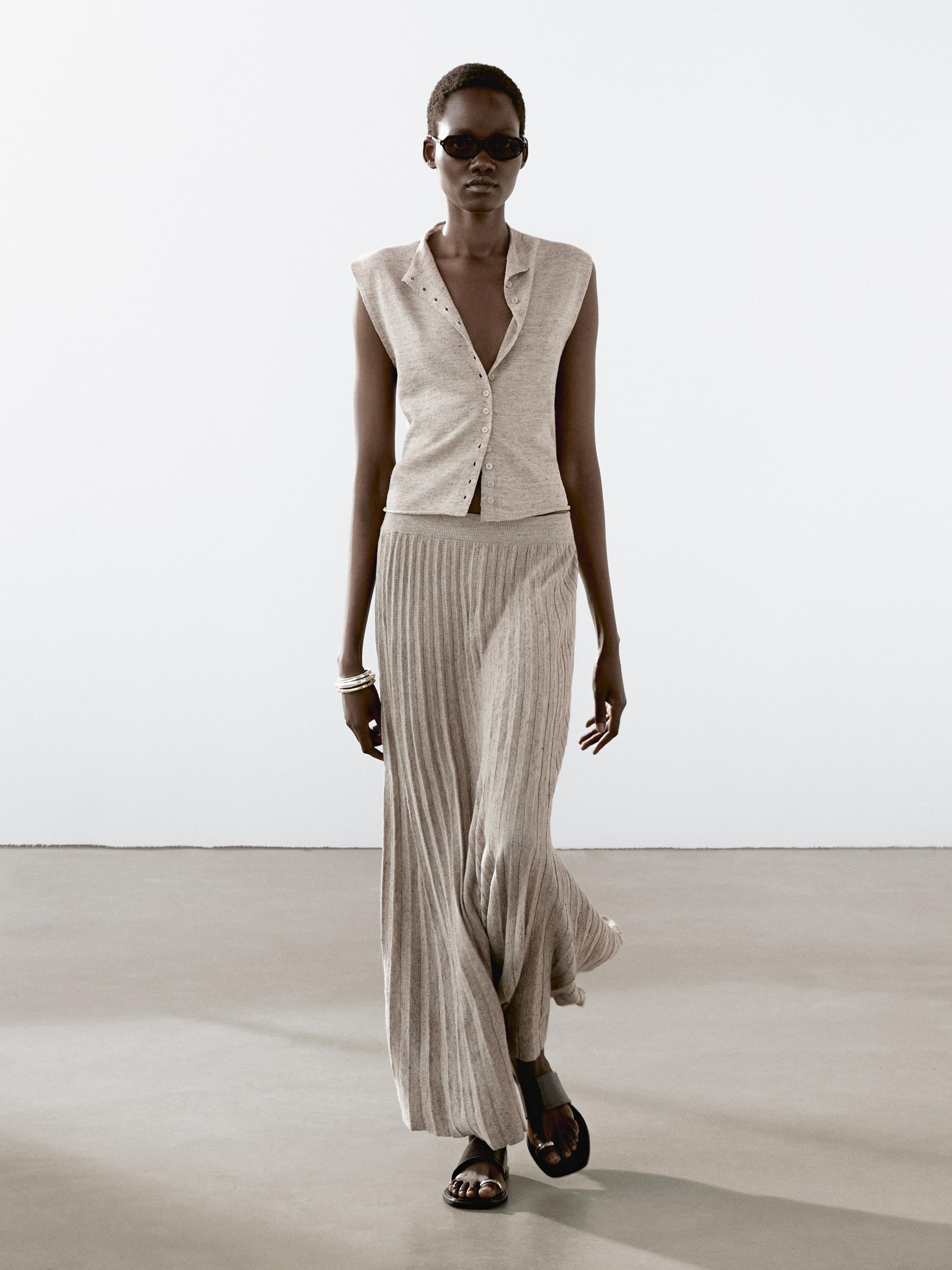 تنورة بليسيه طويلة محاكة. تفصيل شريط خصر مرن. مصنوع من قماش كتان مخلوط.