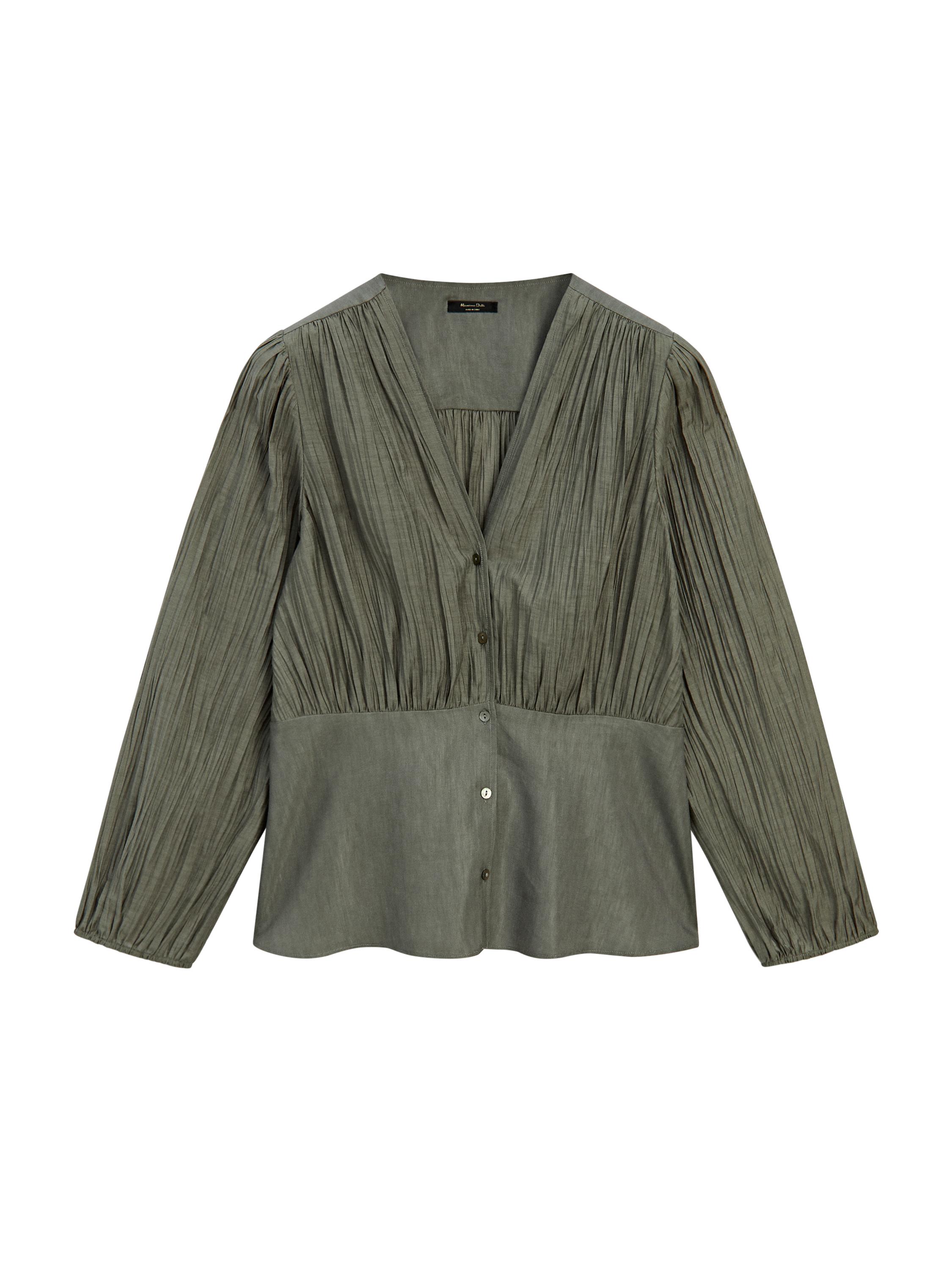فتحة صدر على شكل V . إغلاق بزر. تفصيل بثنيات. تفصيل على الظهر. مصنوع من الكتان المخلوط.