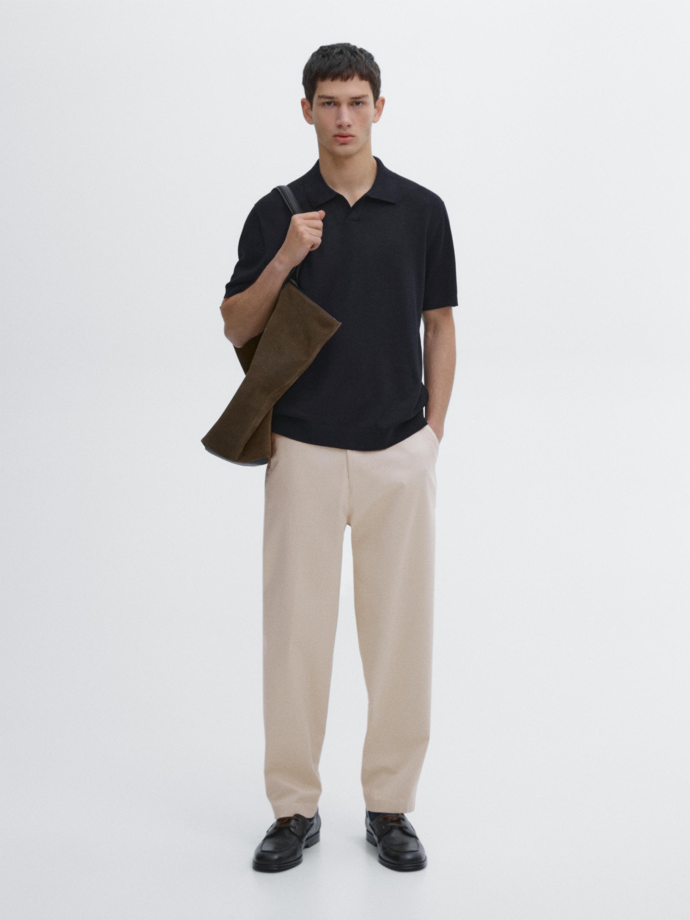 ياقة على شكل حرف V من نوع بولو. أكمام قصيرة. شريط حاشية مضلع .