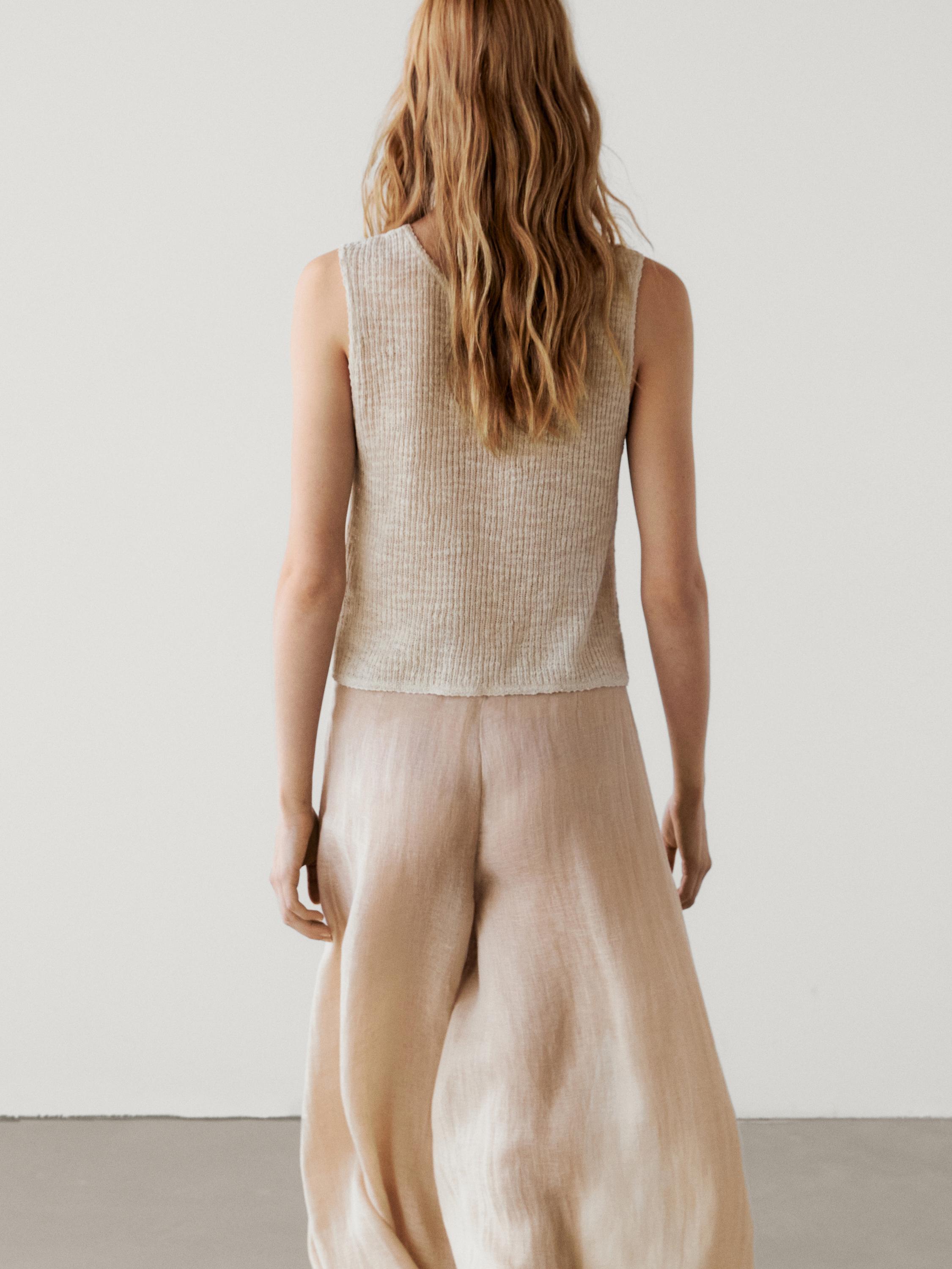 توب محاك مصنوع من قماش قطن مخلوط . ياقة دائرية دون طوق. بدون أكمام. شريط حاشية مضلع . نسيج دقيق، خفيف. قصة مقصوصة. هذا المنتج أقصر من المعتاد.. تصميم واسع ومريح، غير محبوك.