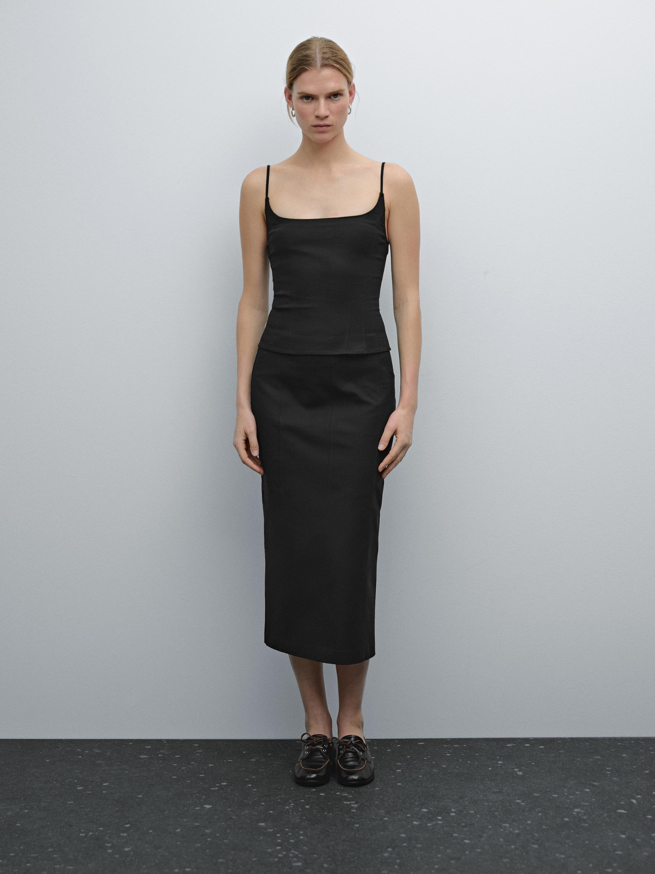 تنورة متوسطة الطول مصنوعة من قماش قطن مخلوط. سحاب بإبزيم. حافة سفلية بفتحة خلفية.