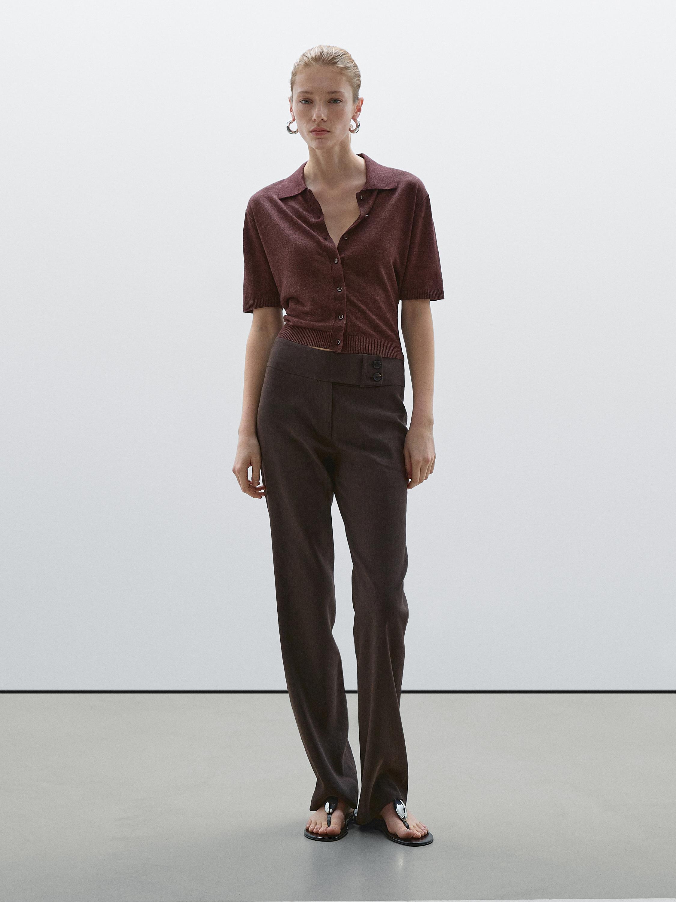 Cardigan maille 100 % lin. Col en V type polo. Manches courtes. Finitions côtelées . Finition effet jaspé. Tissu fluide.