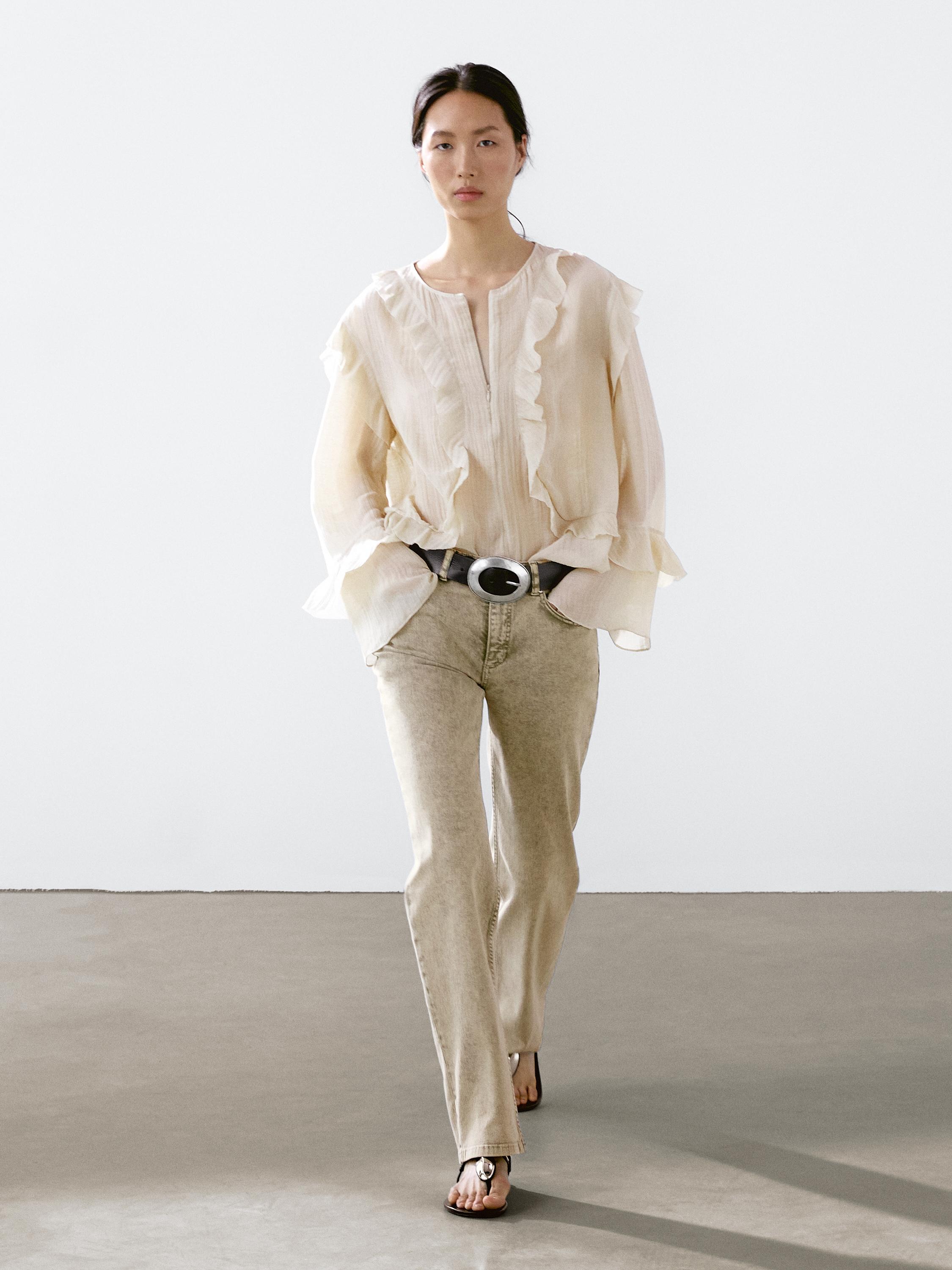 Jean straight : cette coupe présente une silhouette droite de la taille aux chevilles, sans resserrement supplémentaire aux jambes.. Taille moyenne. Fermeture éclair invisible avec patte et bouton. Modèle à cinq poches.
