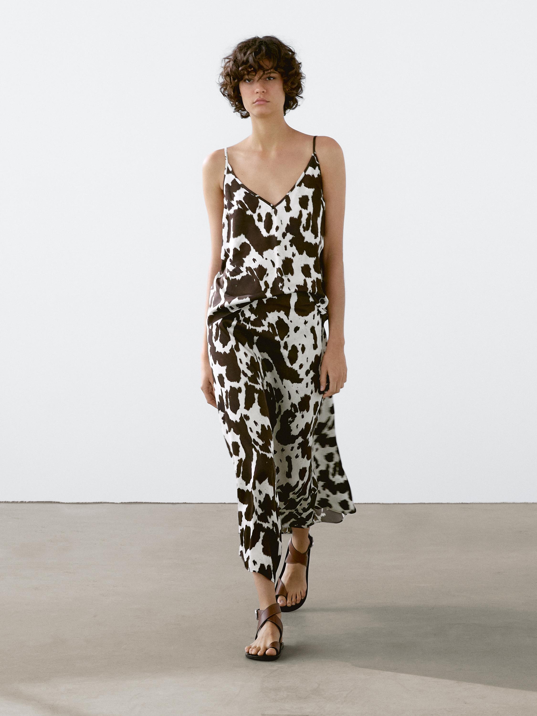 Jupe midi ample. Détail couture centrale . Imprimé animal. Tissu fluide. Dispose de vêtements pour ensembles.