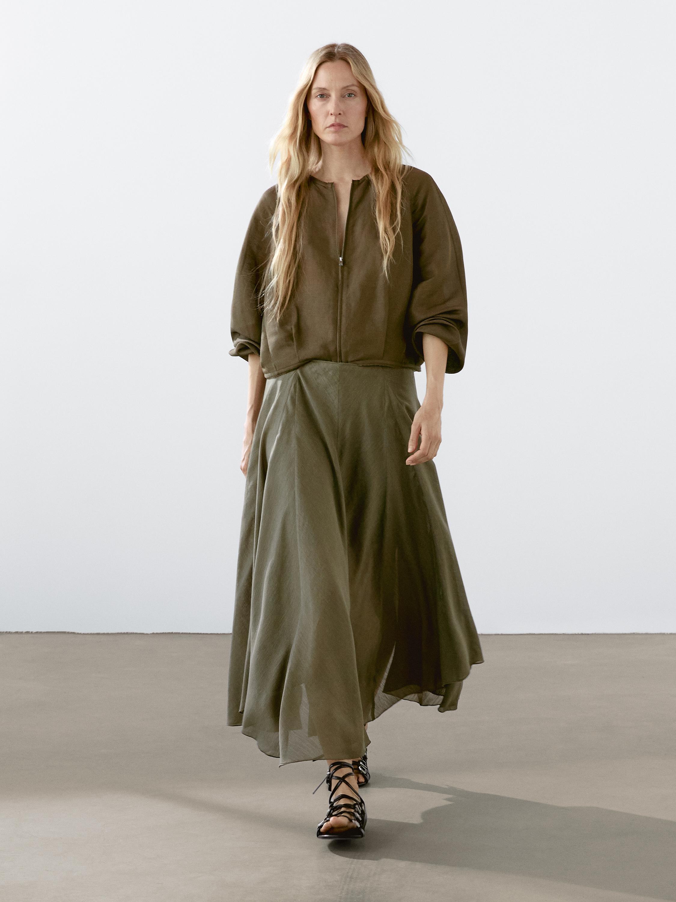 Jupe midi ample. Fermeture éclair à l'arrière. Bas asymétrique. Doublure intérieure. Détail plissé. Tissu fluide.