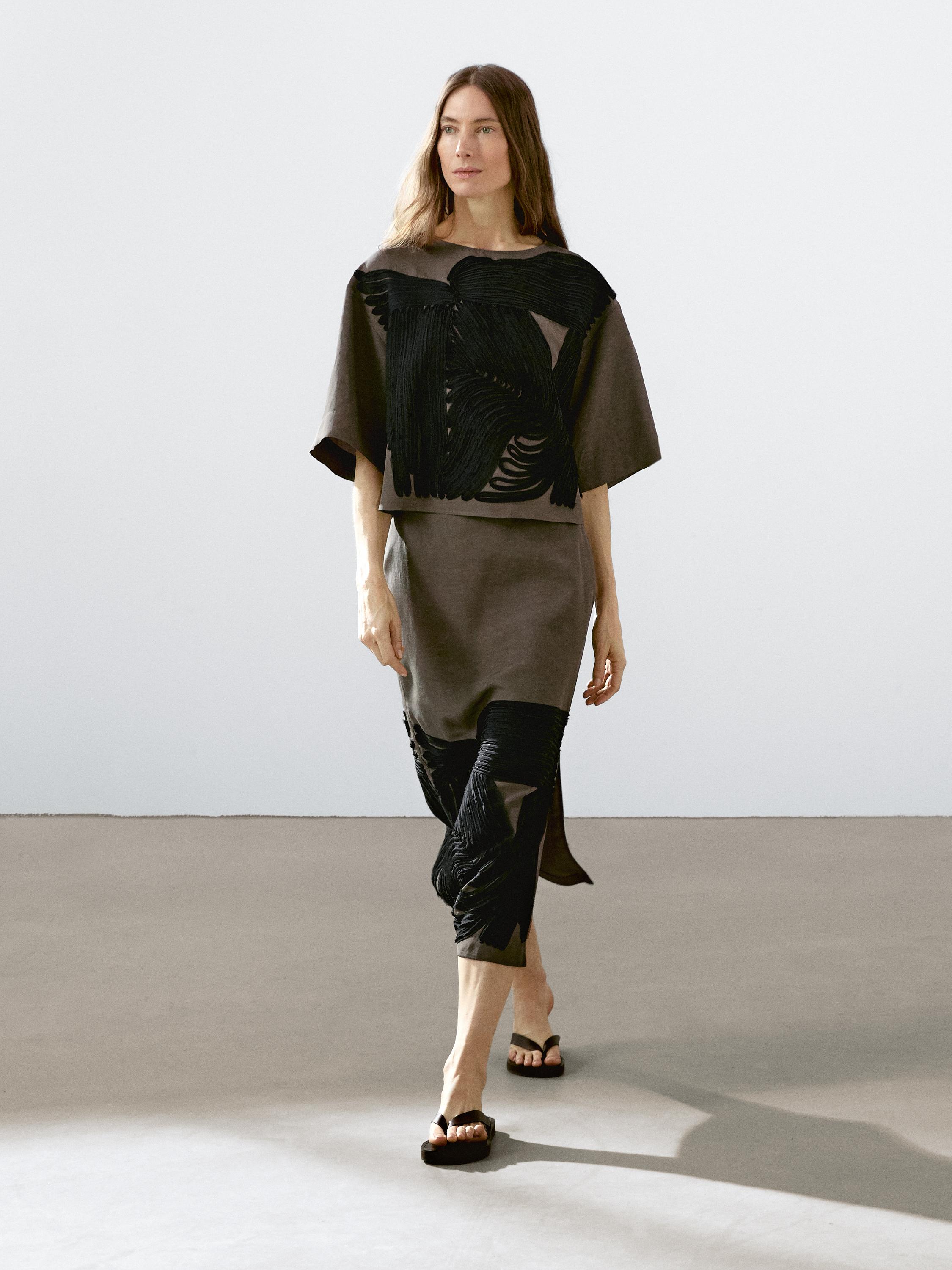 Jupe midi. Finition effilochée. Fente latérale dans le bas. Dispose de vêtements pour ensembles.