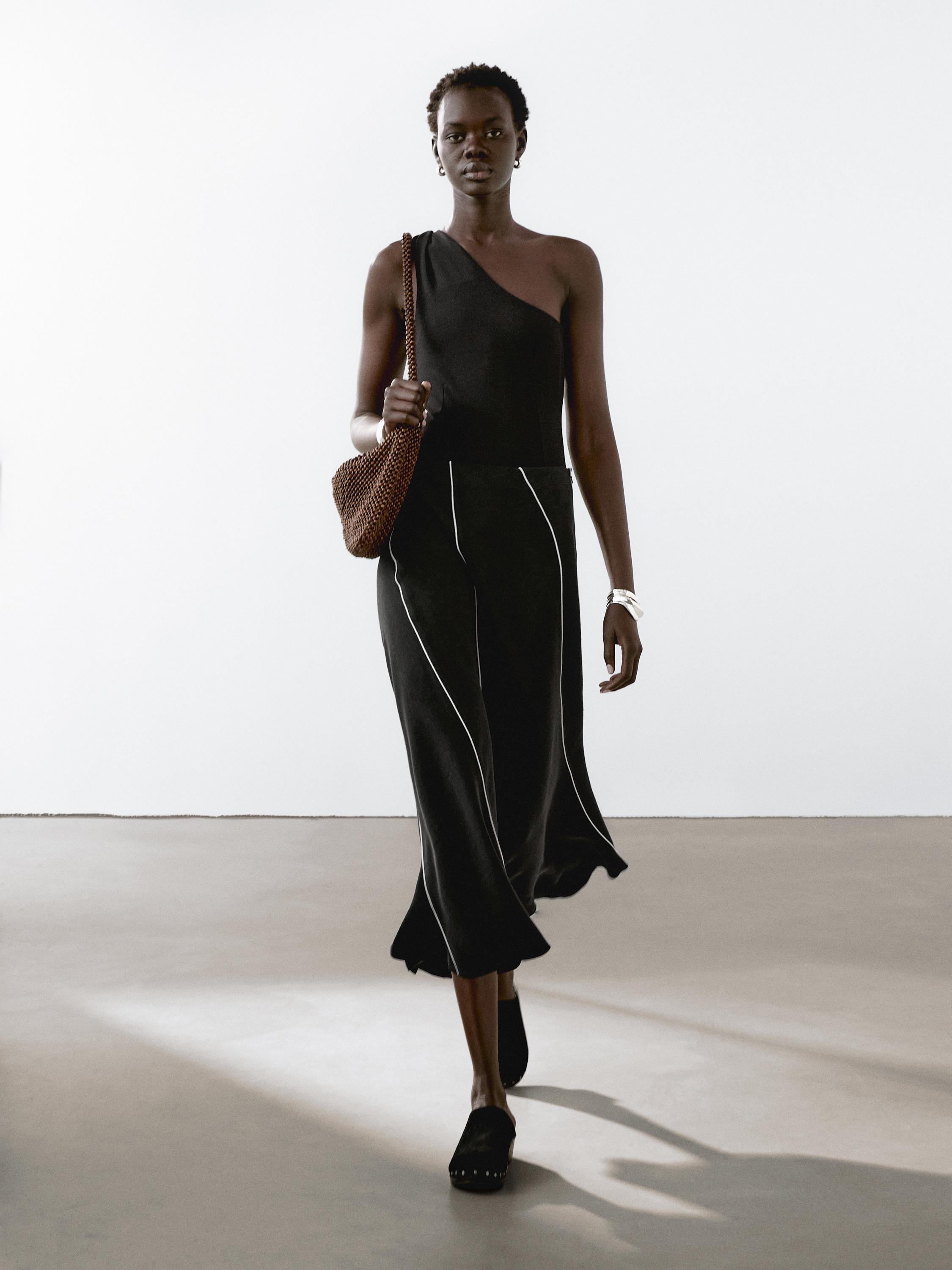 Jupe midi évasée . Coupe fluide. Liserés contrastants.