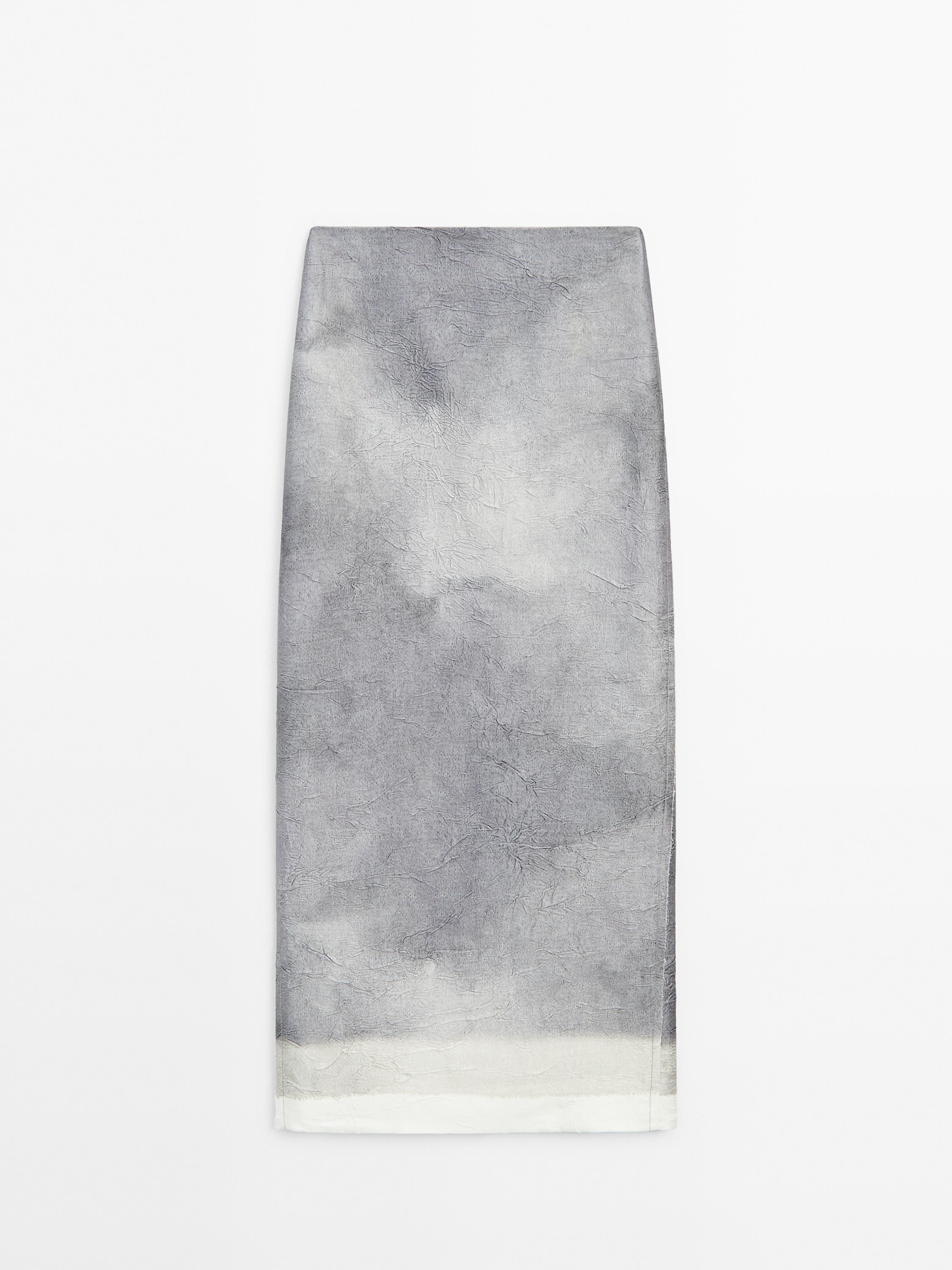 Jupe midi. Imprimé dégradé. Fermeture éclair sur le côté. Bas fendu à l’arrière. Finition effet froissé. Finition satinée. Tissu léger et confortable permettant une bonne mobilité.