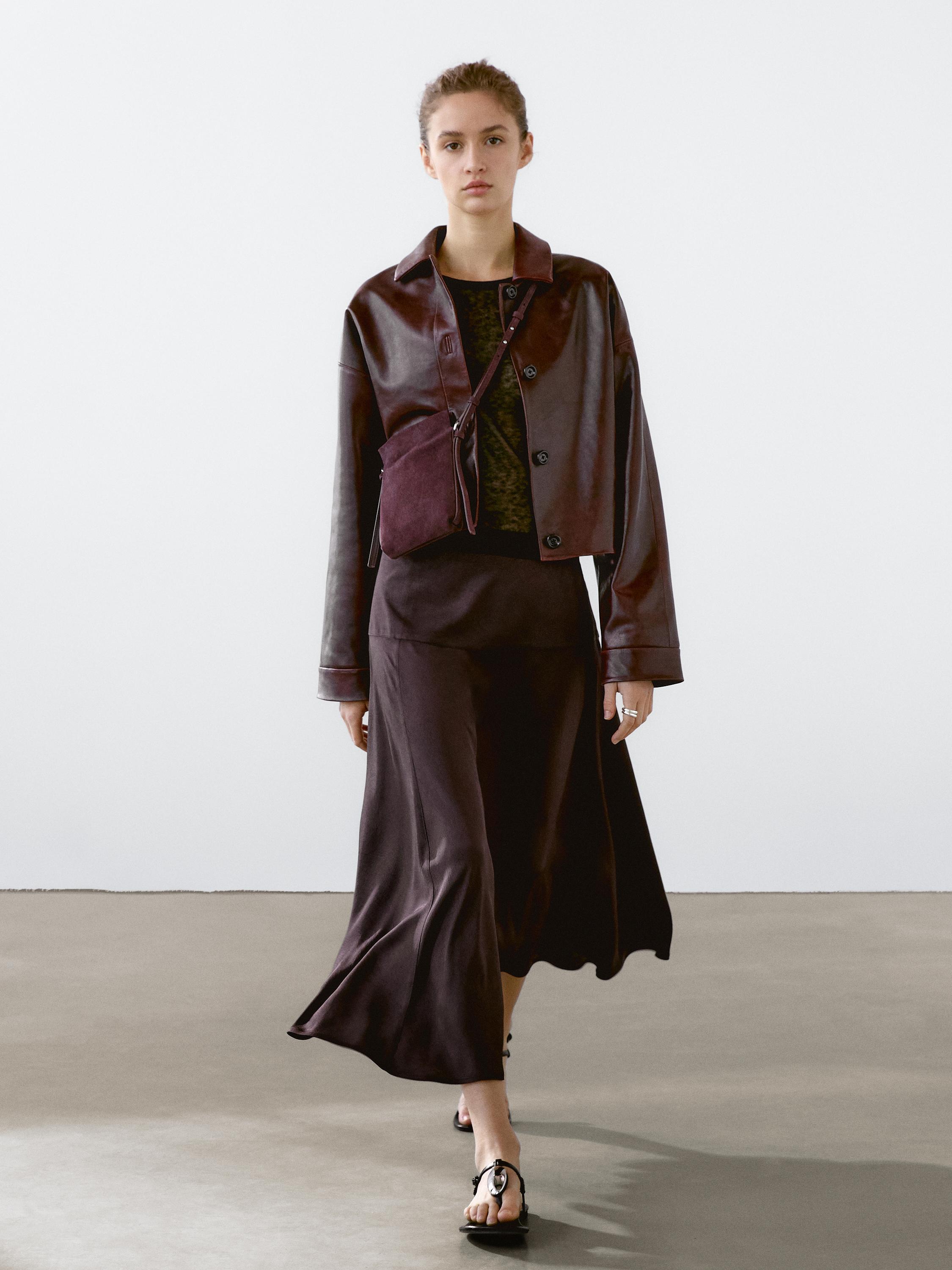 Jupe midi ample. Ornée d’un empiècement. Tissu fluide finition satinée.