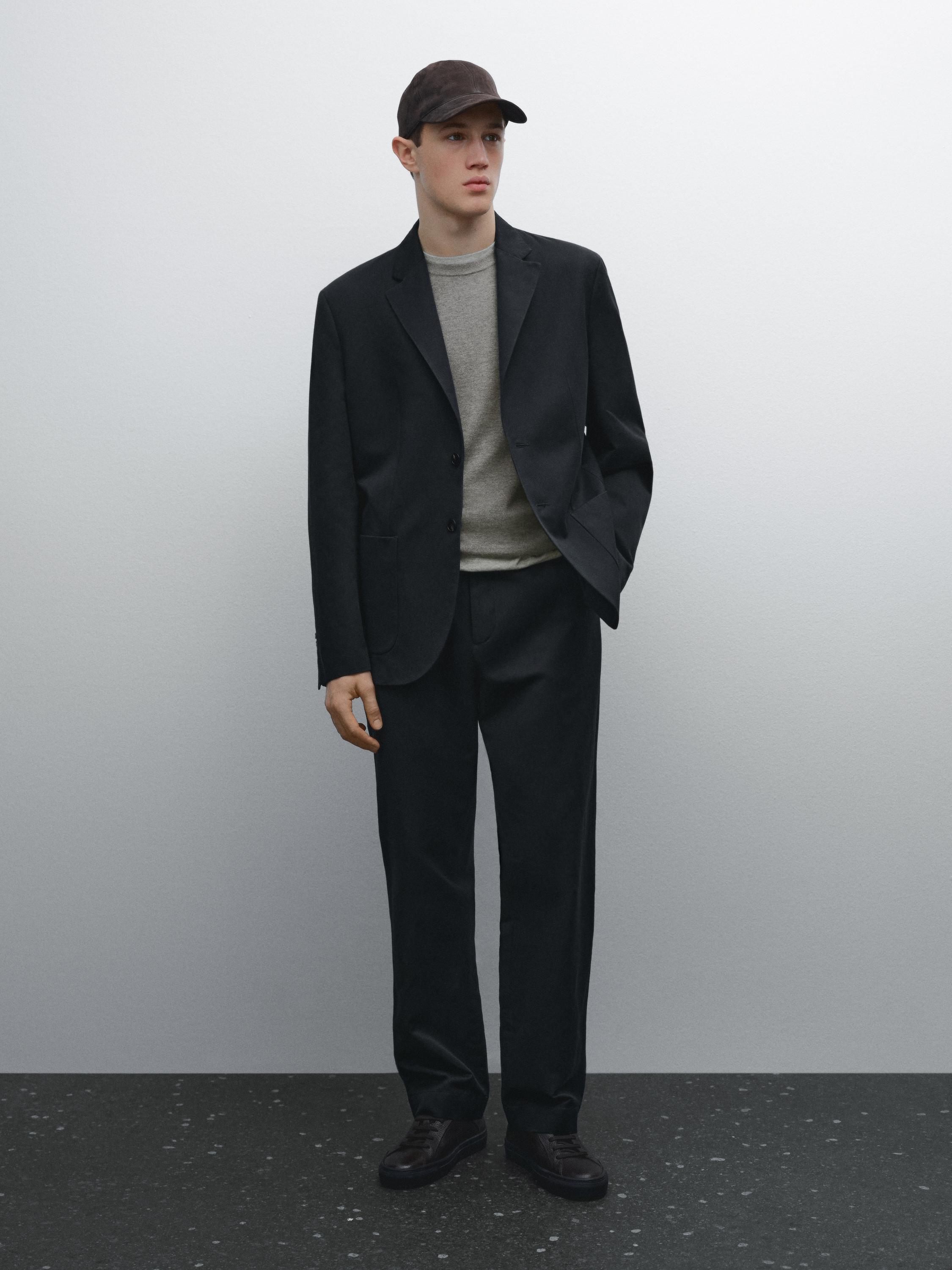 Pantalon coupe jogger : cette coupe présente une taille élastique et réglable ; elle est généralement légèrement resserrée au niveau des jambes, offrant ainsi un style décontracté mais moderne.. Pantalon en tissu contenant du coton. Taille ajustable à l’aide d’un cordon. Deux poches sur les côtés. Deux poches passepoilées dans le dos. Ce vêtement fait partie d’un costume.