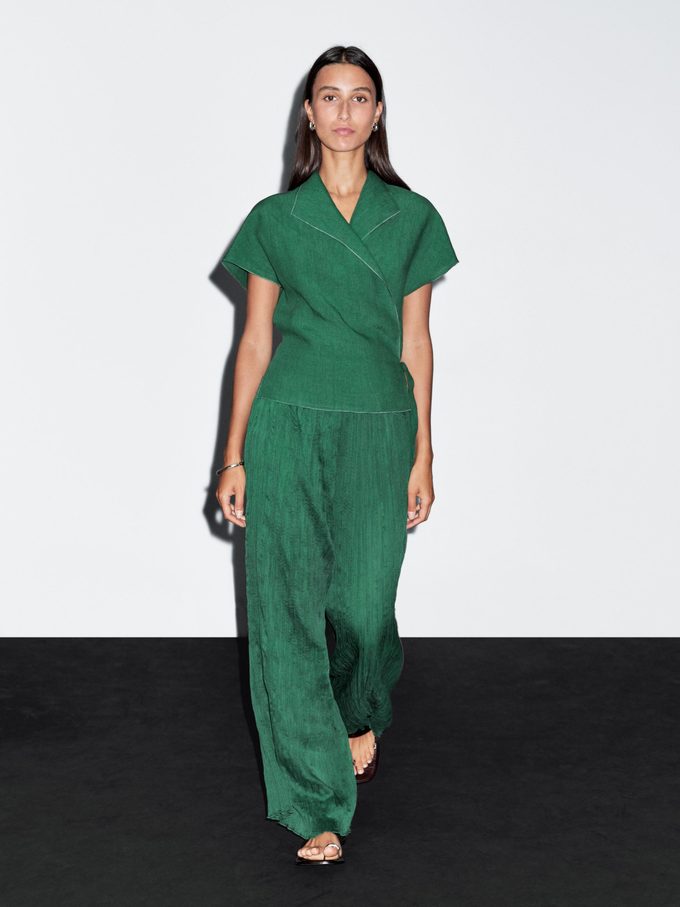 Pantalon en tissu fluide plissé. Ceinture avec élastique. Doublure intérieure. Coupe droite et décontractée.
