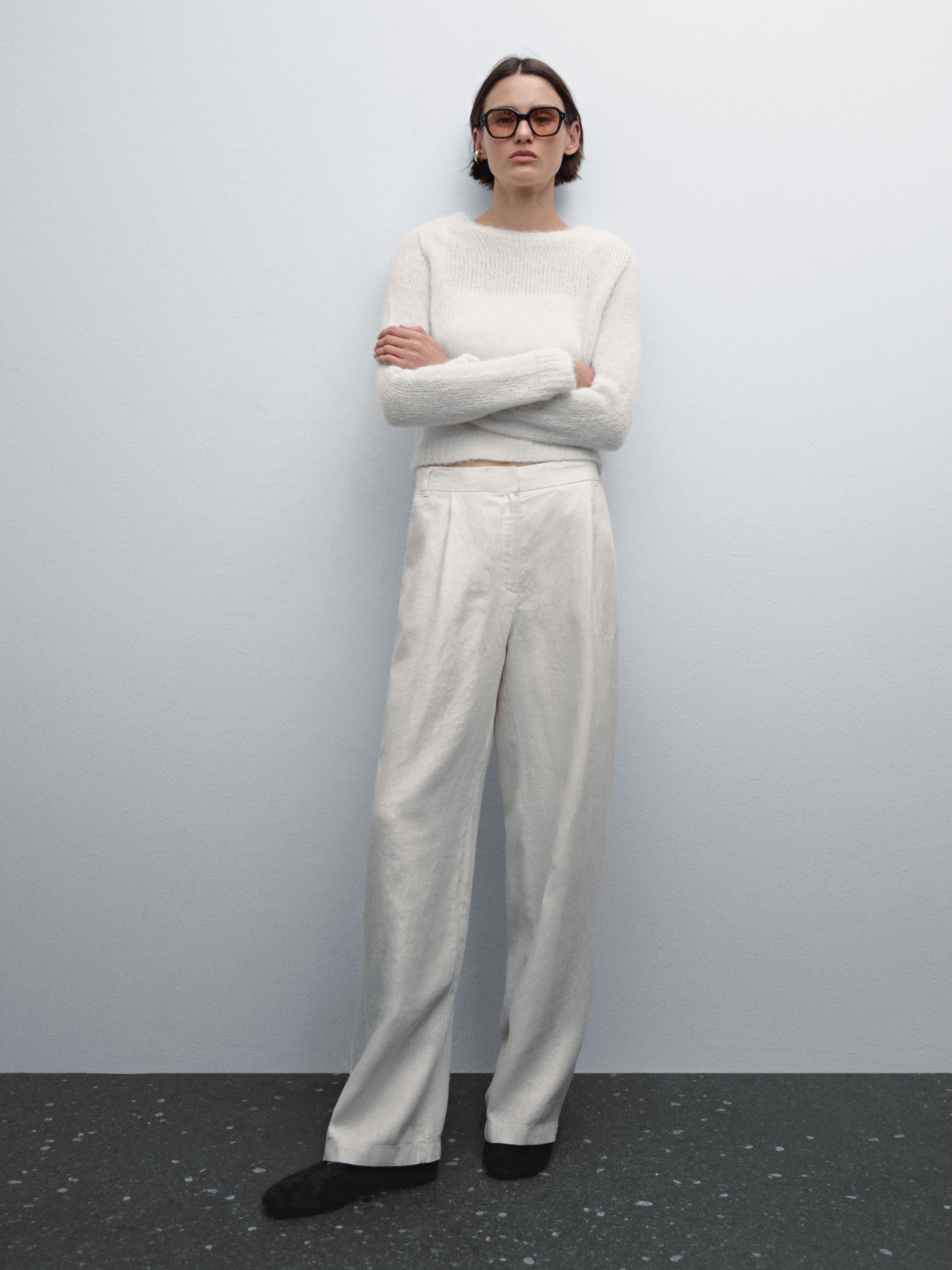 Pantalon wide leg : cette coupe large et ample des hanches aux chevilles confère énormément de confort.. Taille haute. Fermeture Éclair et bouton sur le devant. Partie arrière de la ceinture avec élastique. Deux poches sur les côtés. Une poche passepoilée à l’arrière. Confectionné en pur lin. Tissu fin et léger.