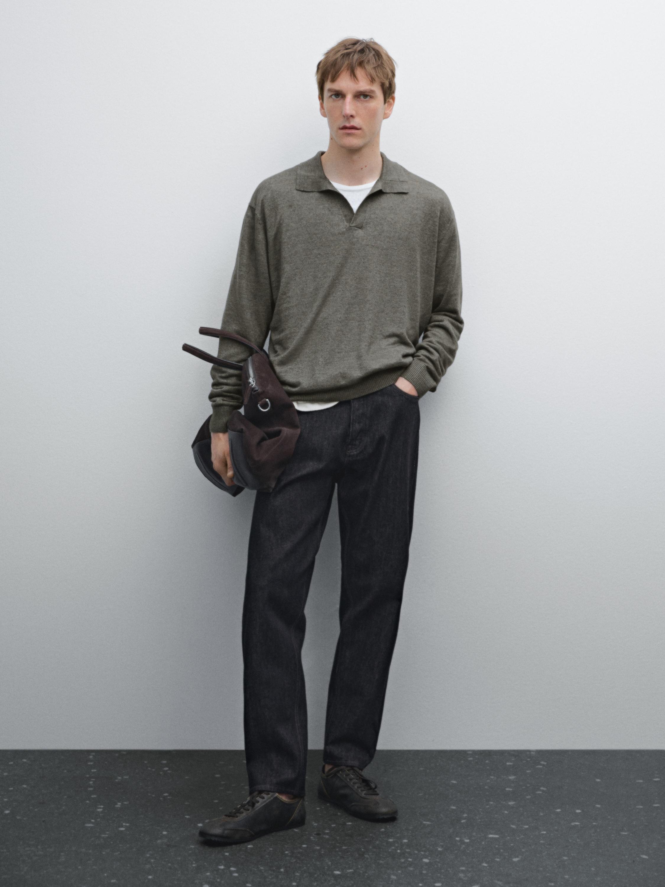 Pull en maille 100 % lin. Col en V type polo. Manches longues. Finitions côtelées . Silhouette ample et décontractée, non ajustée près du corps.