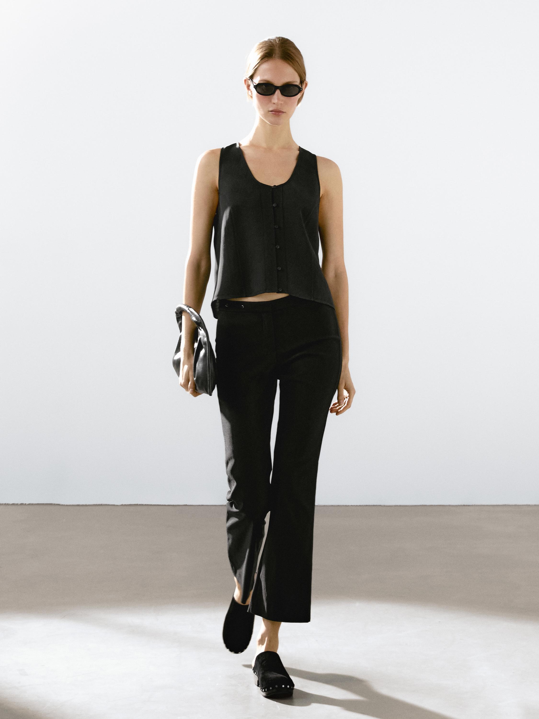 Top with round neck and armhole sleeves. Fermeture par boutons et passants. Coutures visibles . Avec surpiqûres . Ce vêtement est plus court que d’habitude..