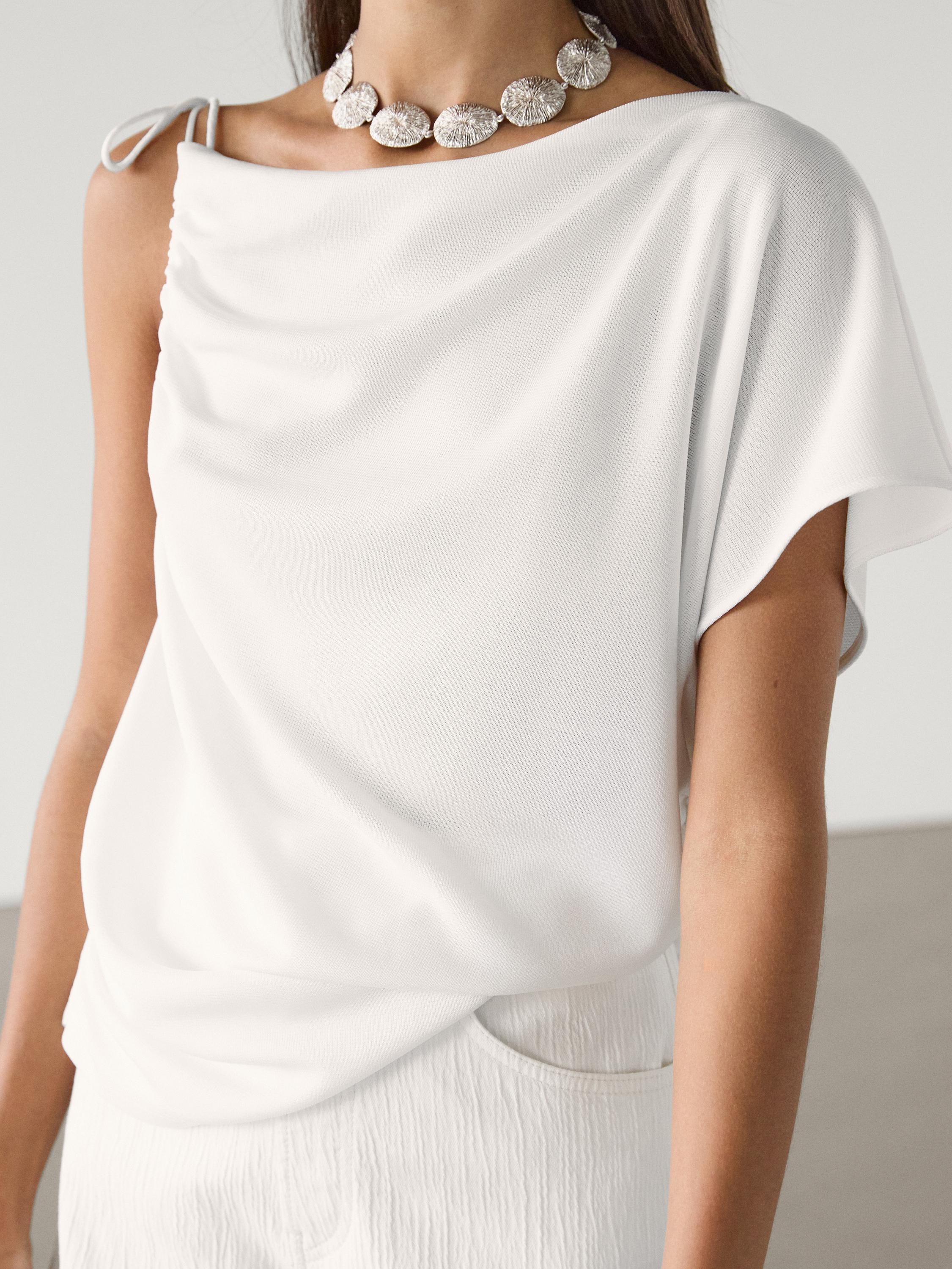 Top with asymmetrical neckline and thin knotted straps. Taille drapée.