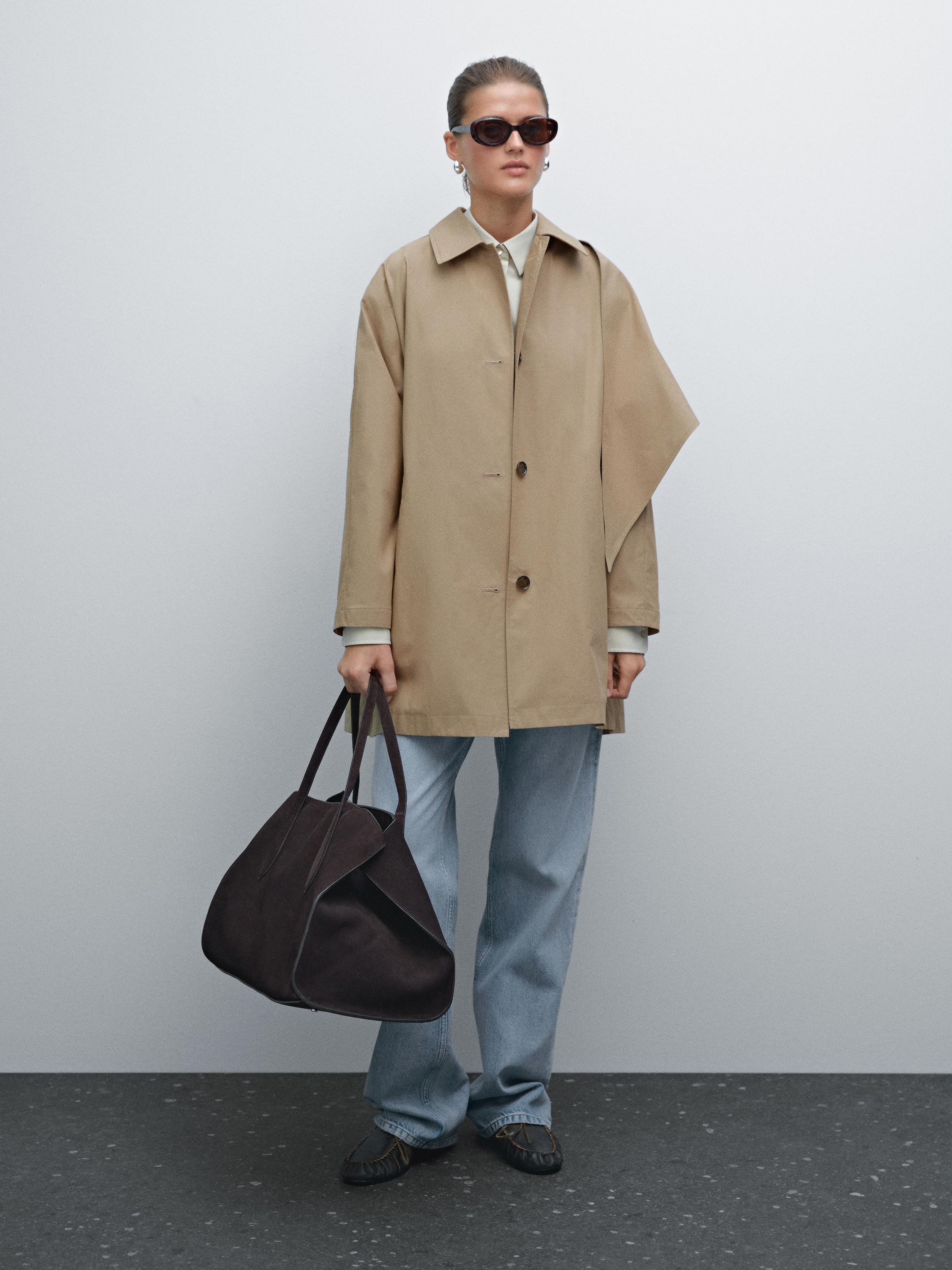 Trench 100 % coton. Col chemise. Fermeture à boutons sur le devant. Buste fendu sur les côtés. Deux poches sur les côtés. Écharpe intégrée au niveau du col .